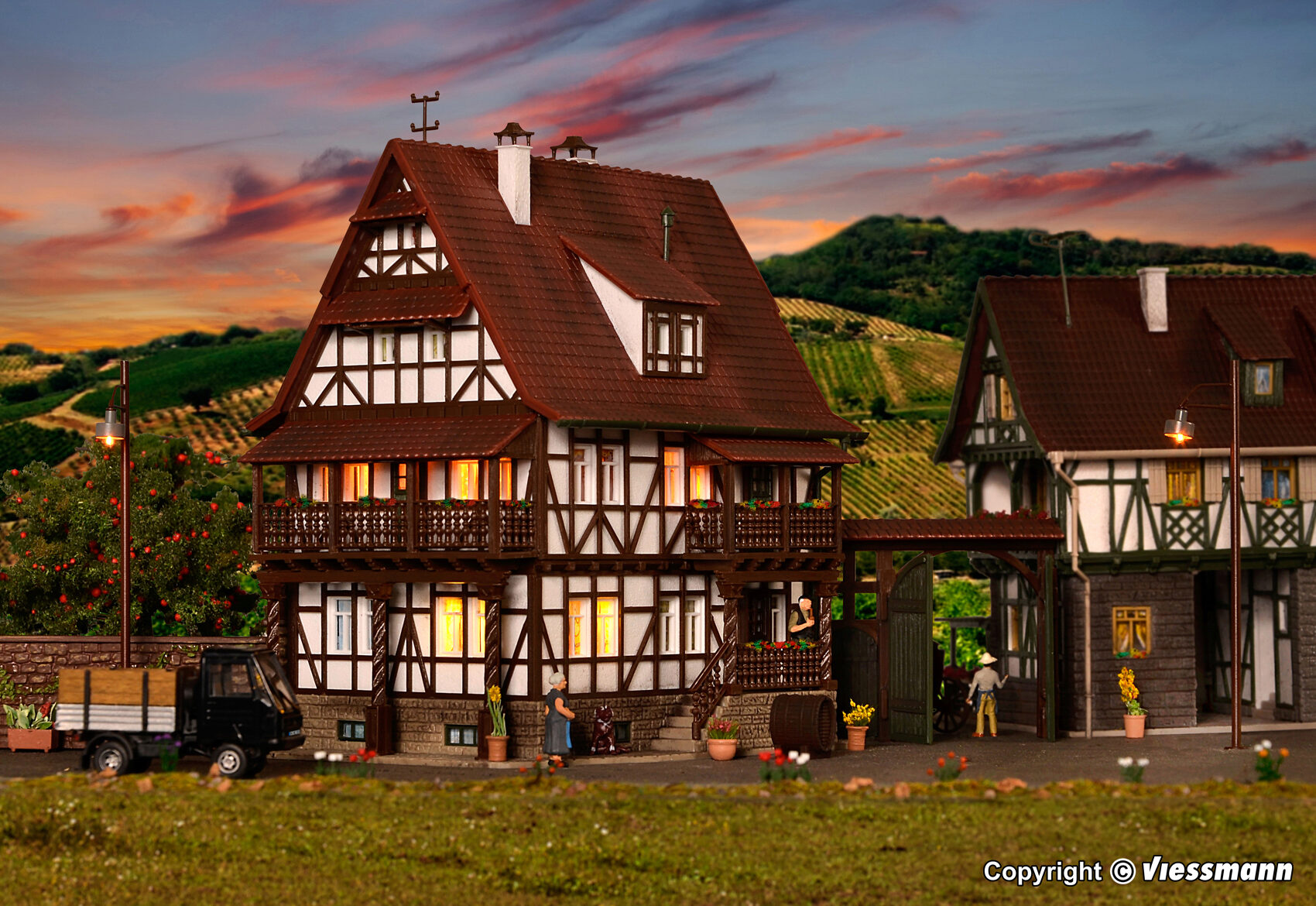 Maße: Gebäude L 12,2 x B 10,5 x H 15 cm, Hoftor L 6,5 x B 1,3 – 3 x H 5,4 cm.