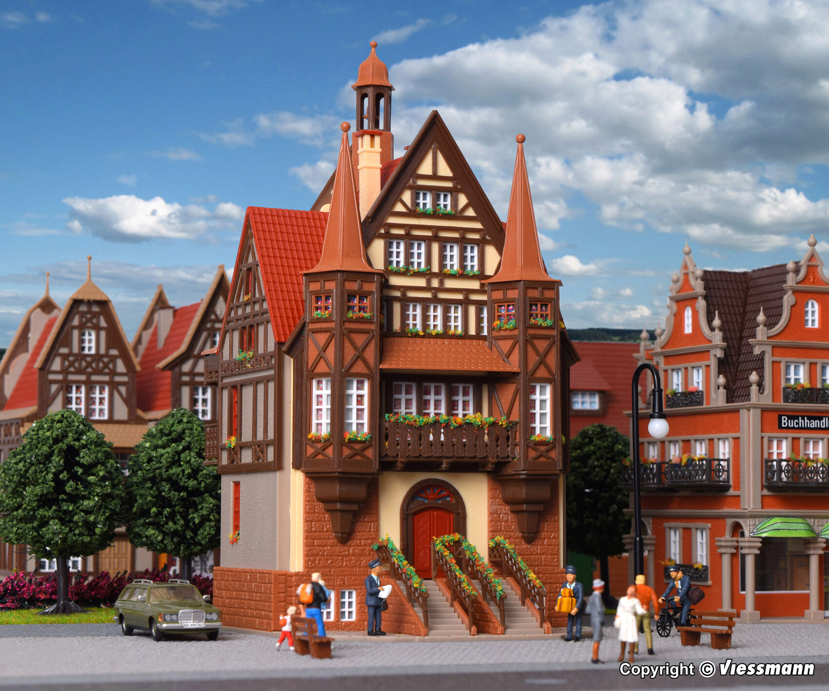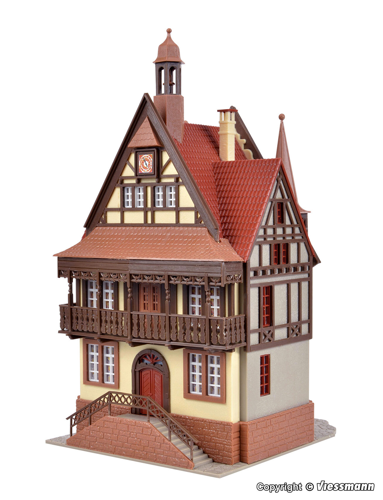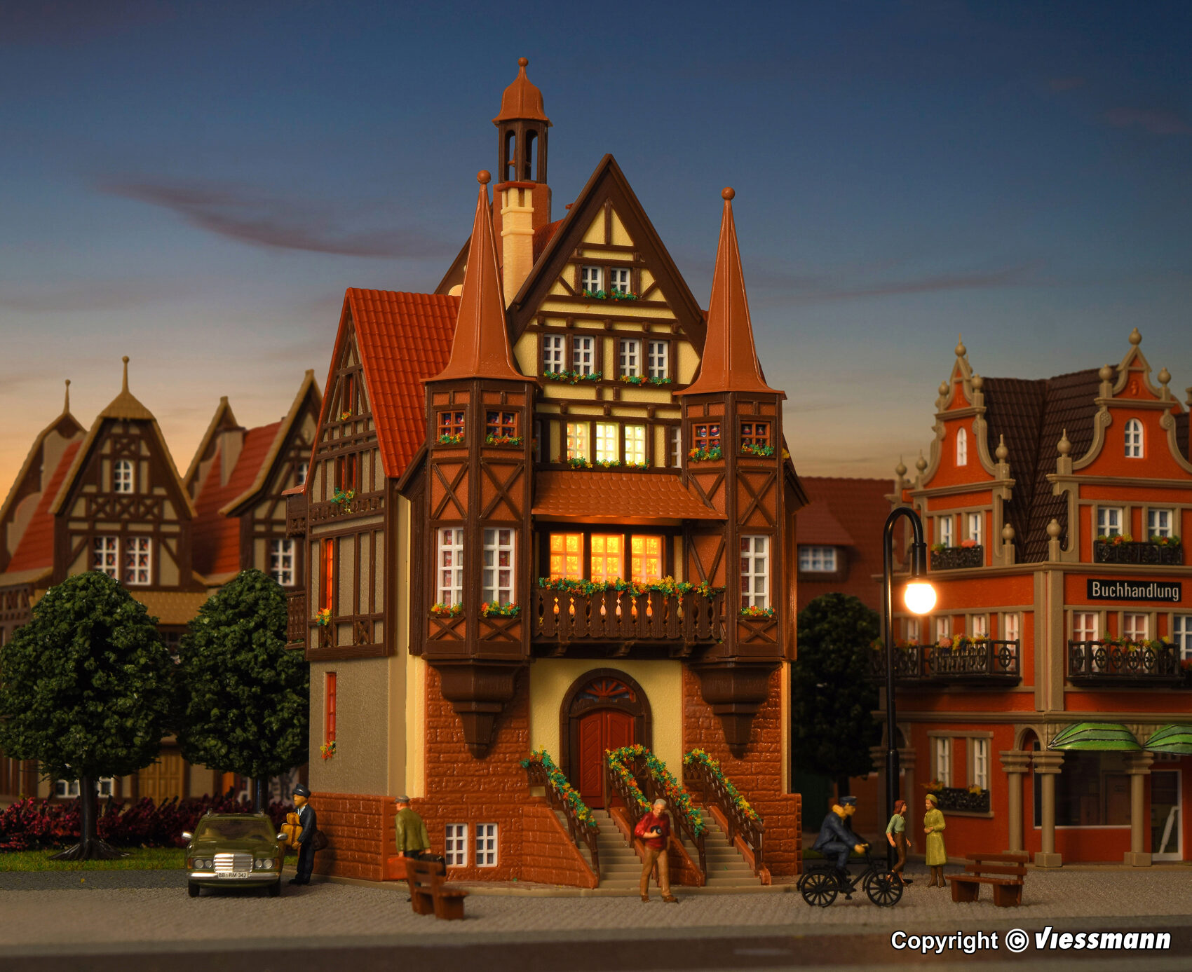 Dieses fein detaillierte Haus im klassischen Patrizierstil erinnert an vergangene Zeiten. Markante Treppenaufgänge an der Vorder- und Rückseite und filigrane Fachwerktürme prägen dieses schöne Gebäude. Maße: L 12 x B 10 x H 19 cm.