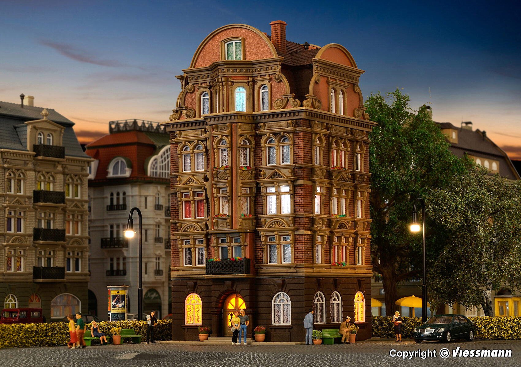 Dieses Modell ist so konstruiert, dass jede Seite eine Sichtseite darstellt. So können Sie z. B. 2 Häuser direkt nebeneinander stellen und sie wirken doch verschieden. Das Gebäude ist mit vielen Details ausgestattet, z. B. Eisengitterverzierungen, zierlichen Balkonen, Stuckfassaden und vielem mehr. Maße: L 11 x B 10,5 x H 20 cm.