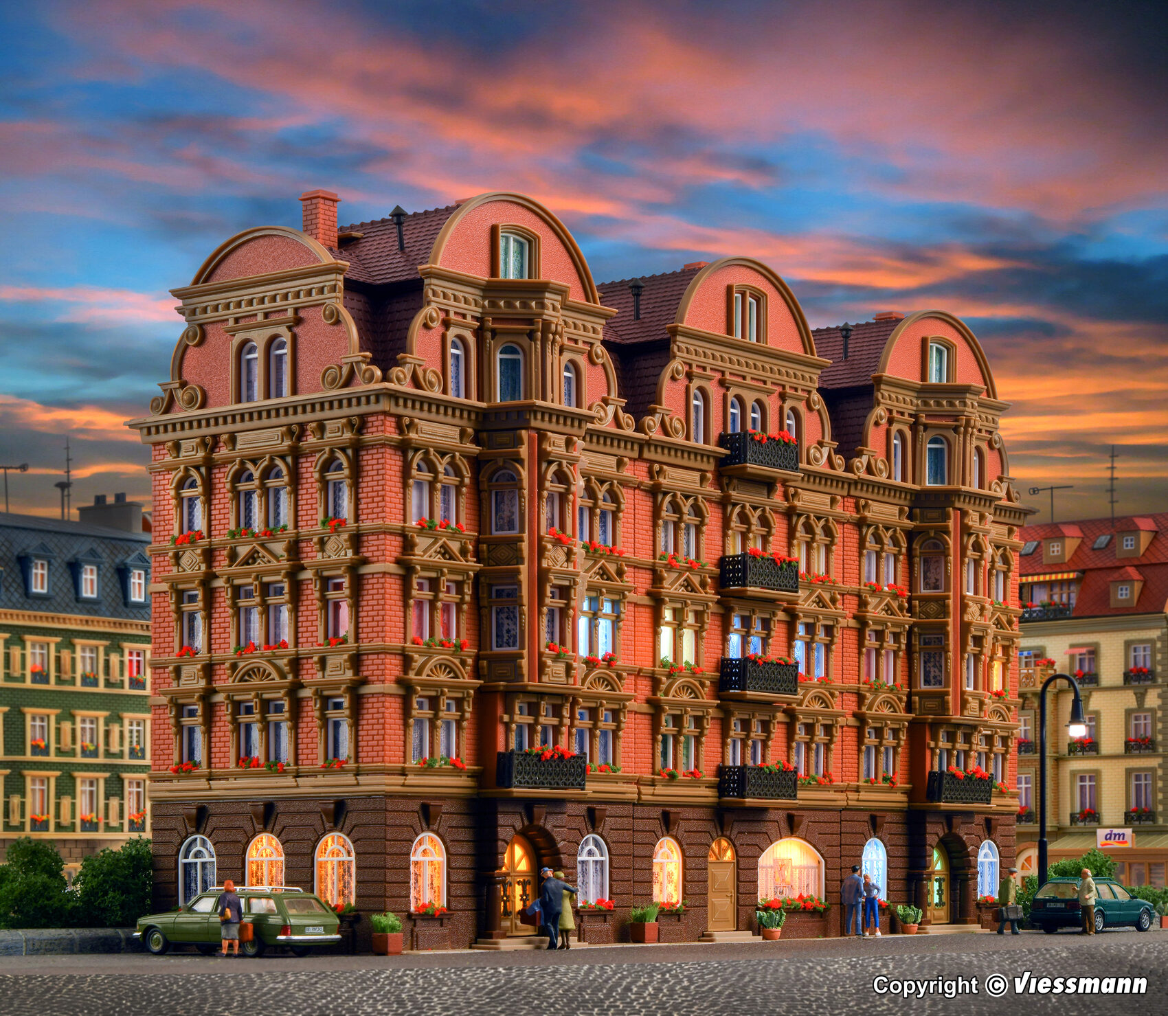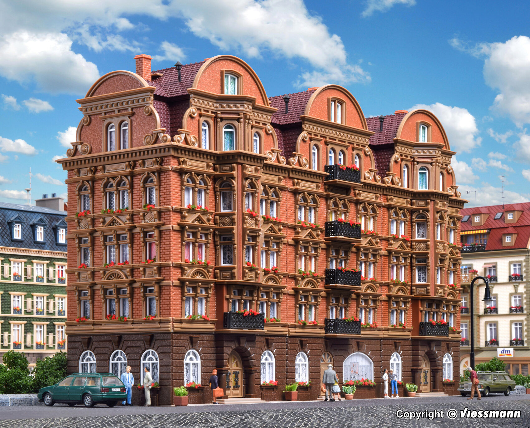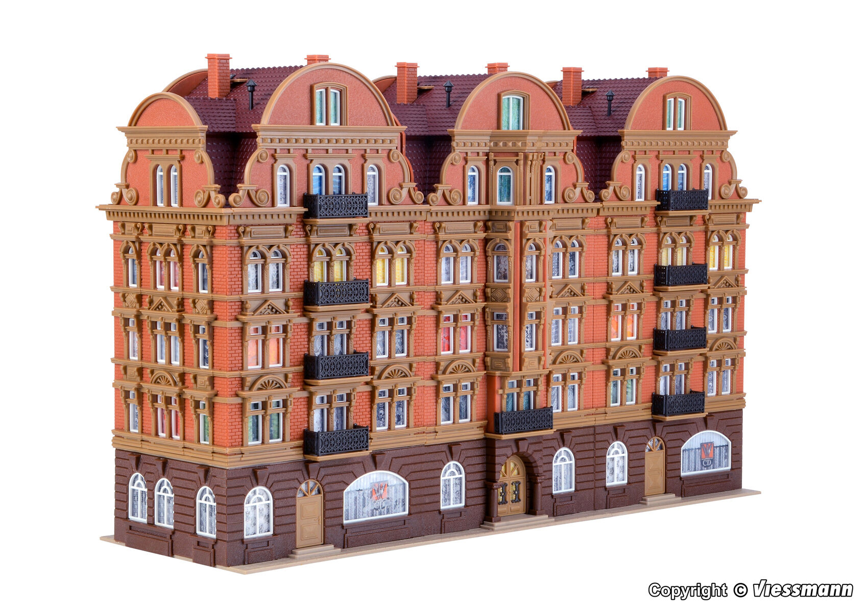 Dieses Gebäude ist mit vielen Details ausgestattet, z. B. Eisengitterverzierungen, zierlichen Balkonen, Stuckfassaden und vielem mehr. Maße: L 31,5 x B 10,8 x H 20,5 cm.