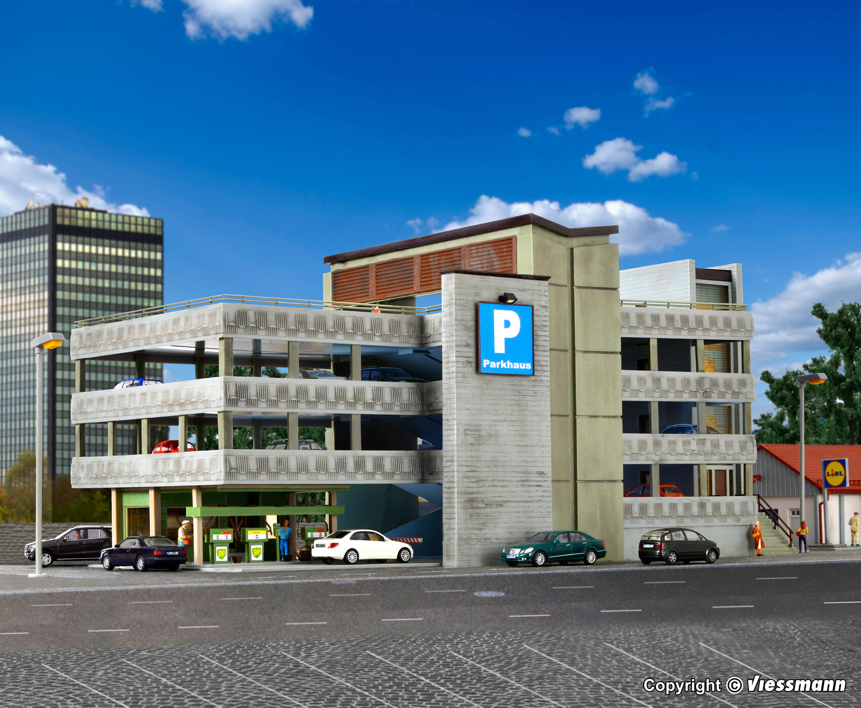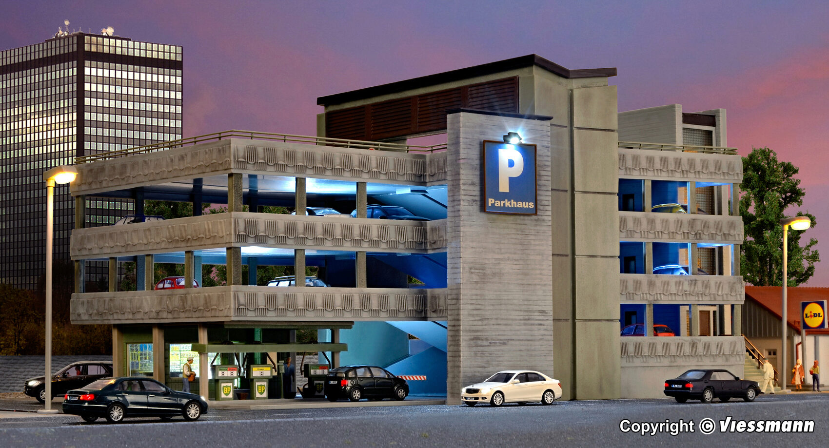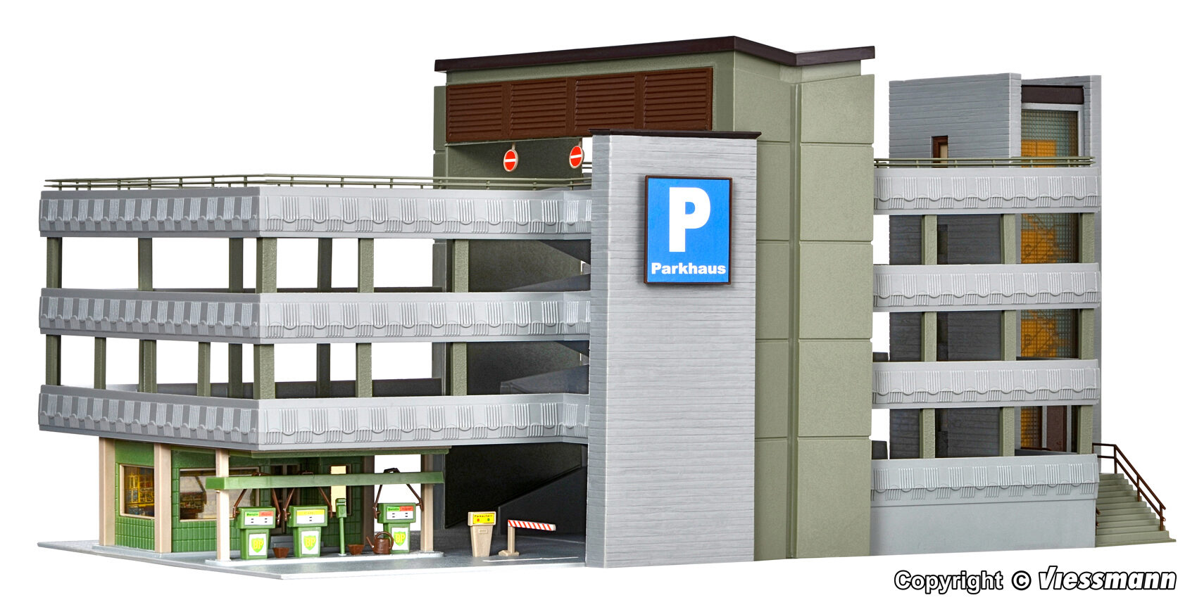 Dieses Parkhaus verfügt über 3 Parkdecks und eine Tankstelle mit 3 Zapfsäulen im Erdgeschoss. Maße: L 38 x B 19 x H 17,5 cm.