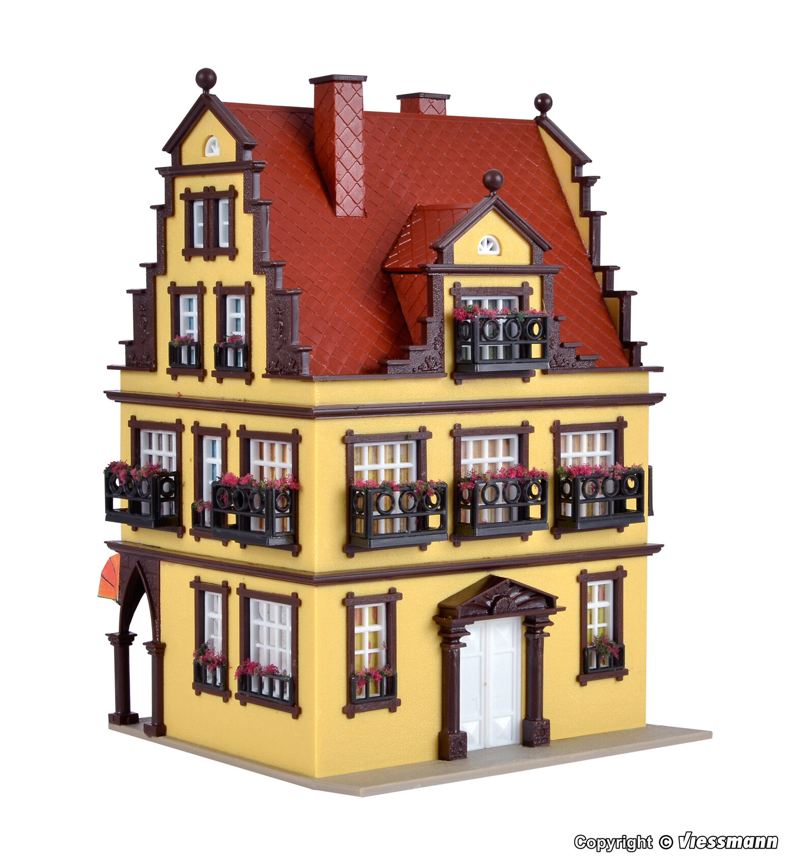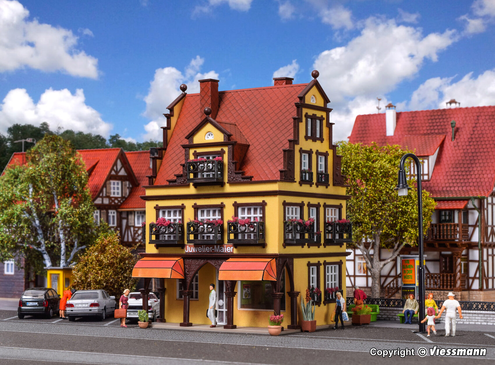 Filigrane Balkone prägen die Fassaden dieses Gebäudes. Die beiliegende Beleuchtung setzt die Inneneinrichtung des Juweliergeschafts im Untergeschoss perfekt in Szene. Maße: L 9,5 x B 8,5 x H 13 cm.