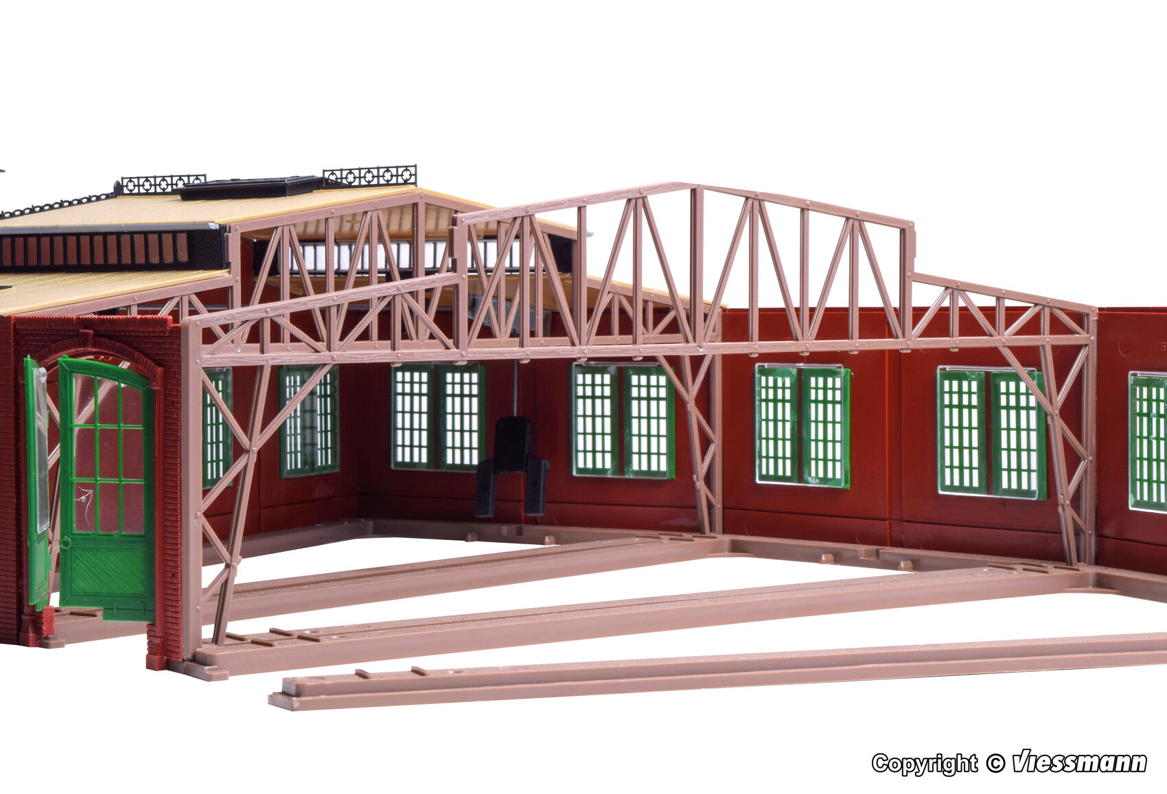Passend zum Ringlokschuppen Art. 45754. Setzen Sie diesen als sechsständigen Ringlokschuppen in Verbindung mit den Drehscheiben von Fleischmann Art. 6152 oder Märklin Art. 7286/7686 ein und möchten Sie eine geschlossene Halle ohne Zwischenwand, so benötigen Sie diesen Dachträger. Maße: L 30 x B 0,2 x H 11,4 cm.