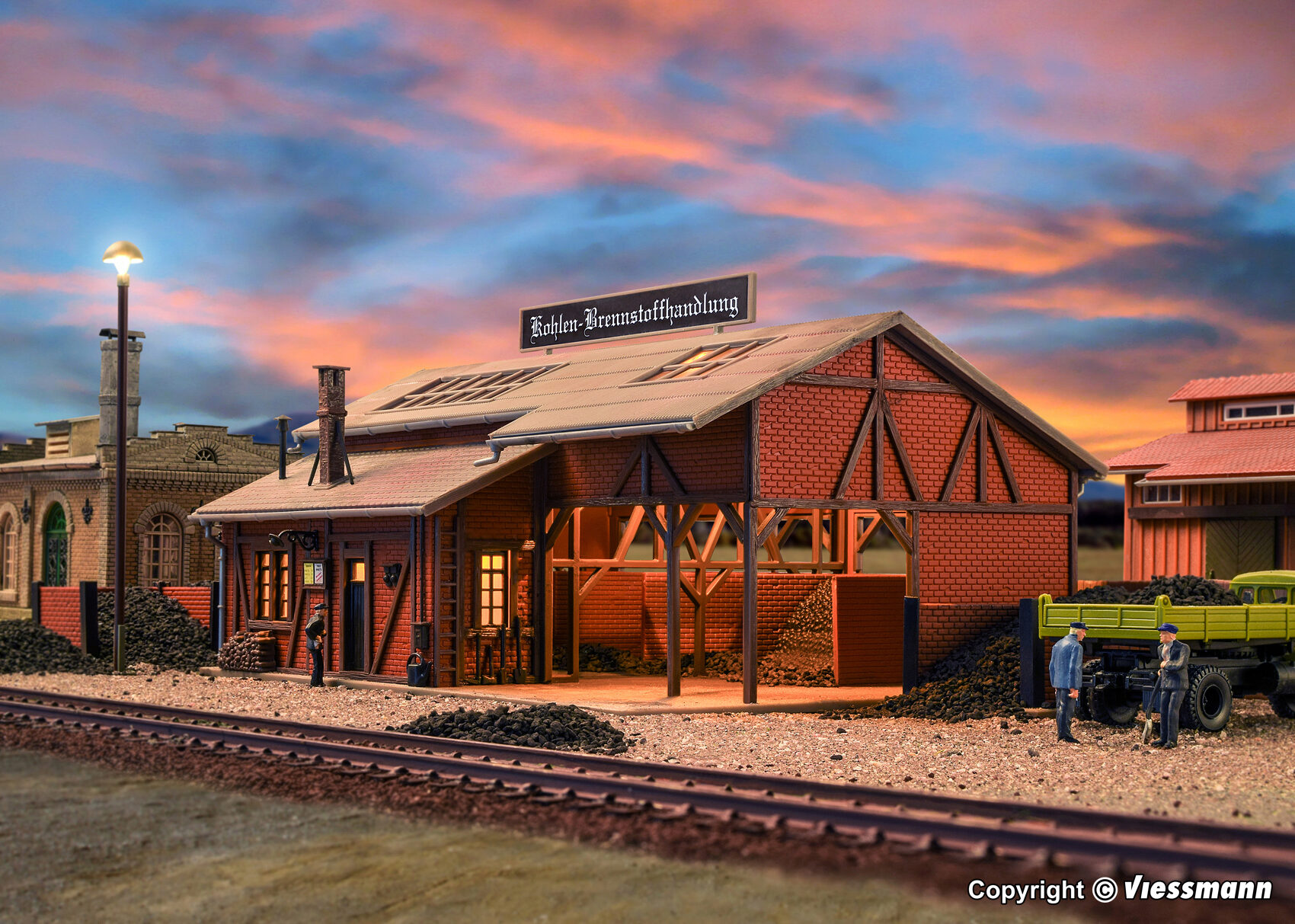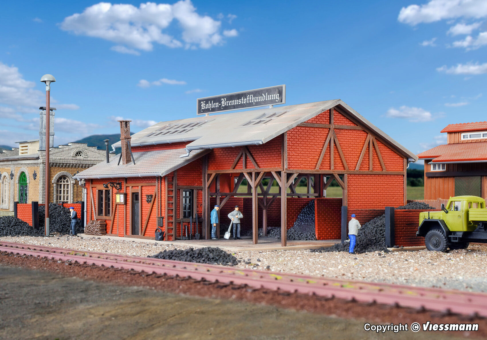 In der Kohlen- und Brennstoffhandlung wird rund um die Uhr gearbeitet. Rußgeschwärzte Gestalten verarbeiten die gerade angekommene Kohlenlieferung. Die innen- und außenliegenden Kohlebansen müssen wieder befüllt werden. In unmittelbarer Nähe zu den Gleise werden dann die Lokomotiven mit neuer Kohle versorgt. Maße: Hauptgebäude L 19,5 x B 14,5 x H 10 cm, Kohlenlager groß L 8,2 x B 4,2 x H 2,5 cm, Kohlenlager klein L 6,2 x B 4,2 x H 2,5 cm.