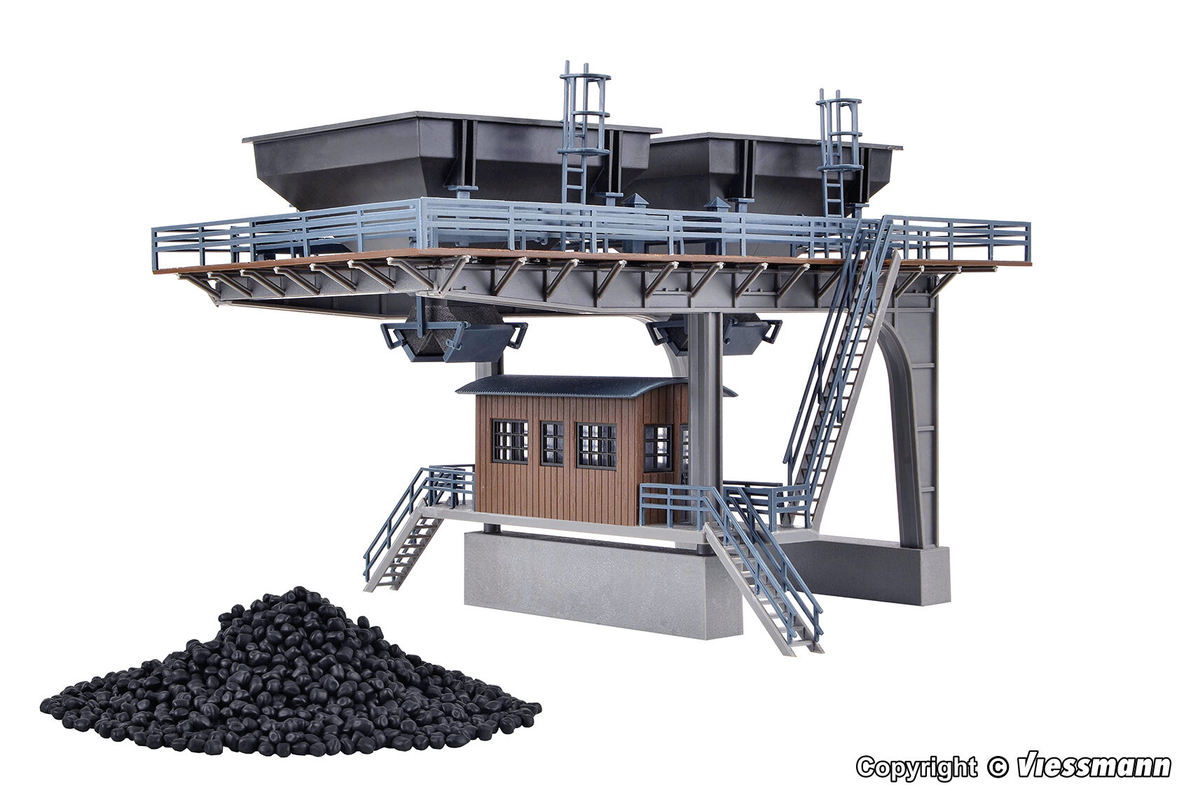 Eine Großbekohlungsanlage war im Zeitalter der Dampflokomotiven im Bahnbetriebswerk unverzichtbar. Noch heute strahlen solche Industriebauten Charme und Anziehungskraft aus. Diese Großbekohlungsanlage hat 2 voneinander unabhängige Kohleabfüllbehälter. Durchfahrtshöhe: 6,7 cm, Gleismittenabstand: 9,5 cm. Maße: L 19,3 x B 17 x H 13,8 cm.
