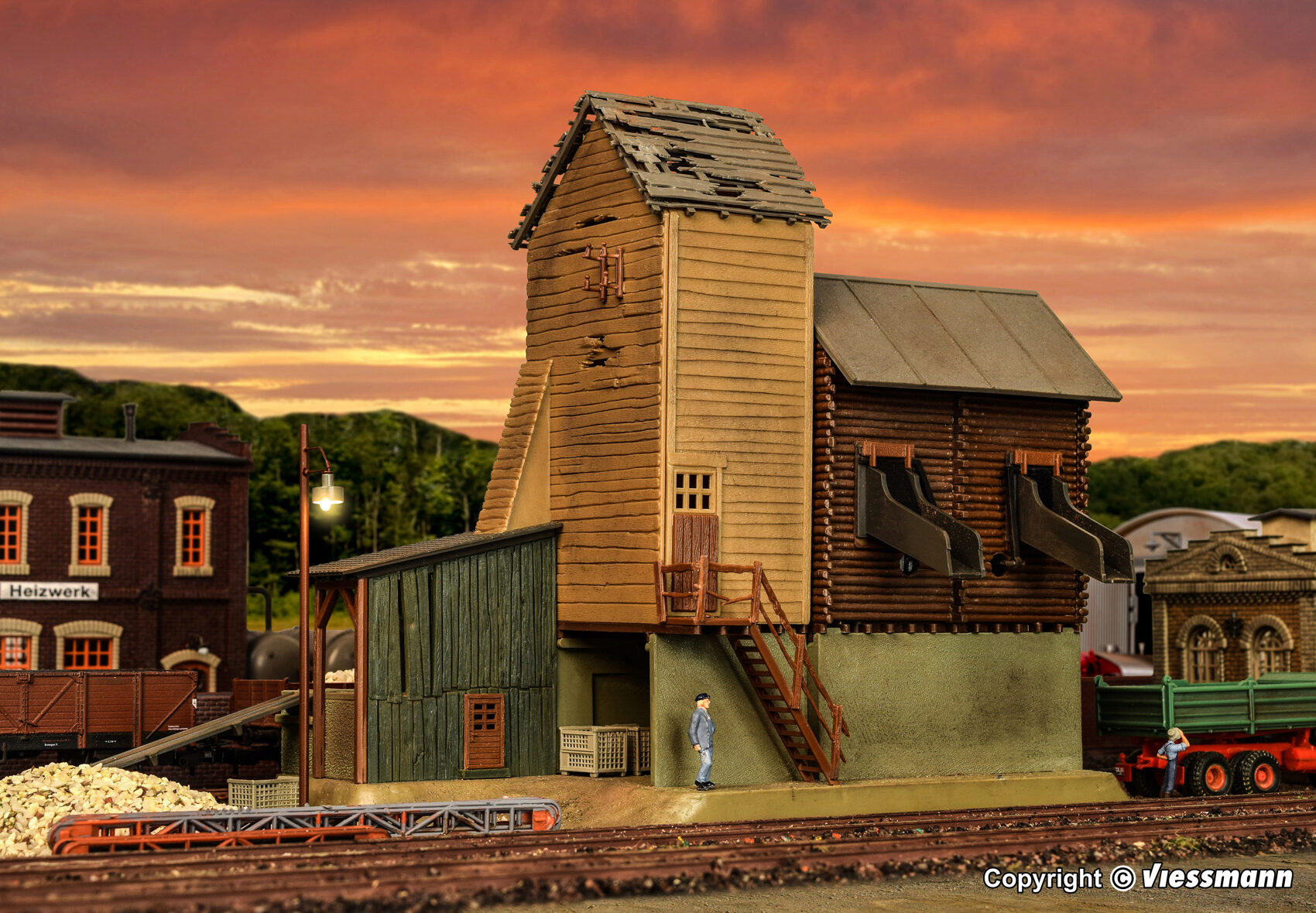 Funktionsbausatz. An diesem alten Kieswerk kann der Kies über eine Öffnung im Dach ins Innere befördert werden. Durch elektromagnetische Betätigung der Verschlussklappen gelangt der Kies über Laderutschen in die zum Abtransport bereitstehenden Güterwagen. Maße: L 28,5 x B 13 x H 17 cm.