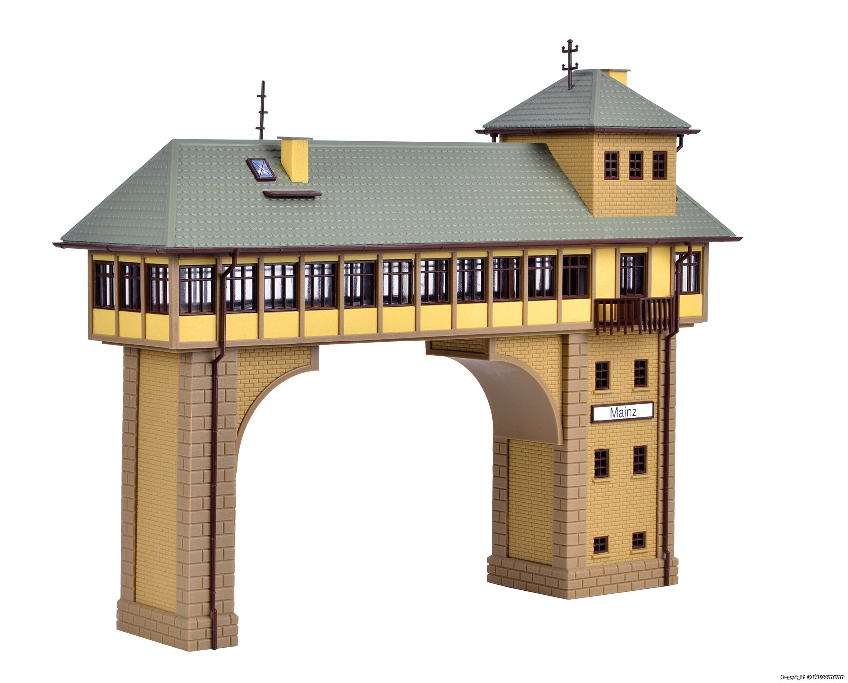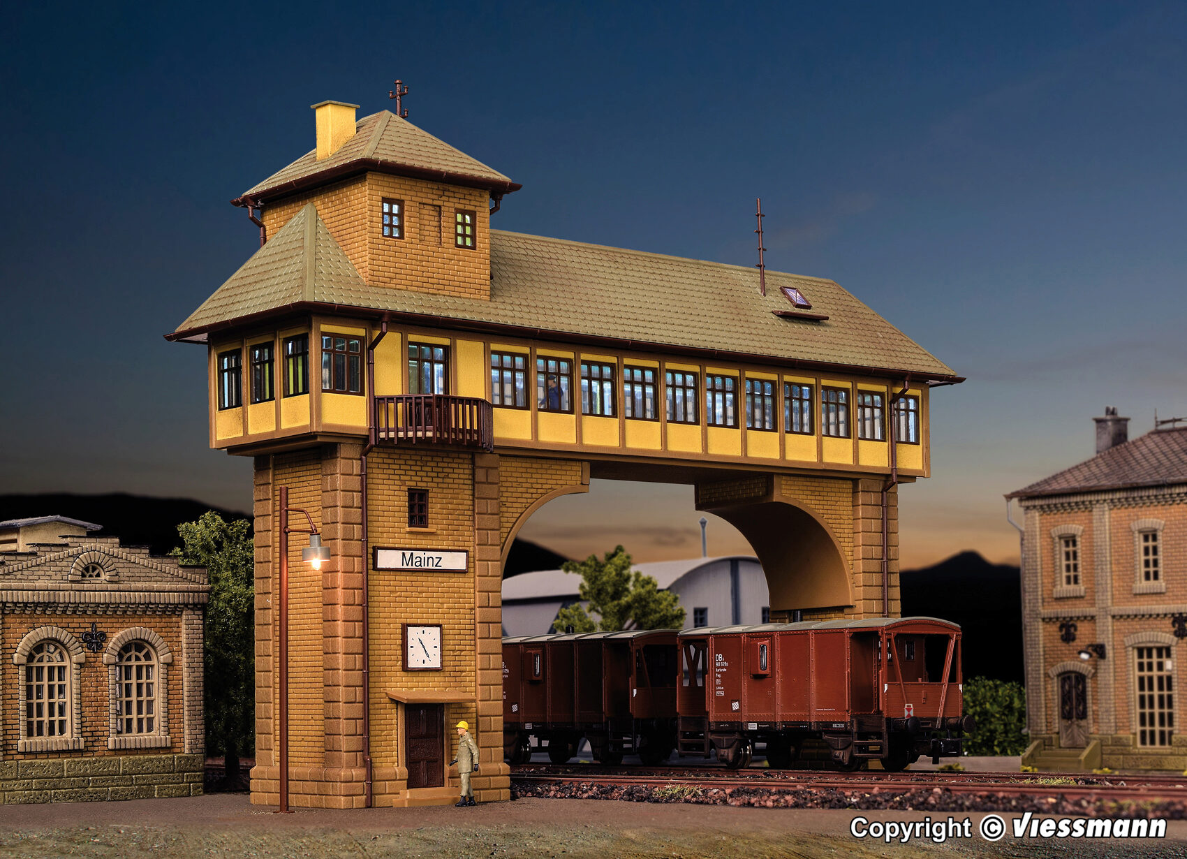 Das Reiterstellwerk besticht durch seine Form- und Farbgebung. Heller Sandstein, das Dach mit Ziegeln gedeckt, so erhebt es sich majestätisch über den Gleisen. Es überspannt 2 Gleisstrassen und die Durchfahrtshöhe ist für alle Schienenfahrzeuge geeignet. Liebevoll gestaltet ergänzt es ideal Ihren Bahnhofsbereich. Durchfahrtshöhe: 8,9 cm, Durchfahrtsbreite: 13 cm. Maße: L 23,5 x B 7 x H 18,5 cm.