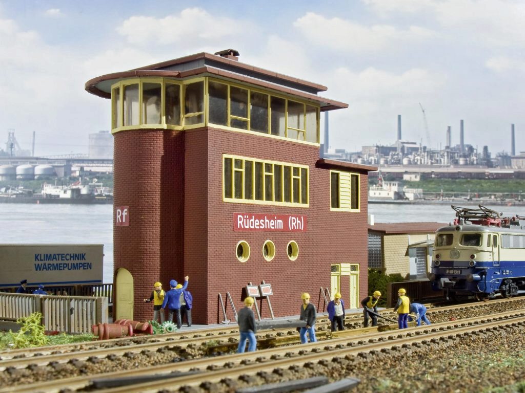 Das Stellwerk Rüdesheim ist ein Einheitsstellwerk, errichtet zwischen 1920 –1930. Diese Form war zu dieser Zeit mehrfach an Bahnstrecken vorzufinden. Die Architektur ist schlicht, mit dem gewissen Etwas der Bauhauszeit. Errichtet wurde es in Klinkerbauweise. Vermutlich kam der hintere Anbau erst später dazu und seit einer Renovierung setzt die gelbe Fensterrahmenfarbe tolle Akzente. Lassen Sie sich von der Persönlichkeit dieses Stellwerkes bezaubern. Maße: L 18,5 x B 8 x H 18,6 cm.