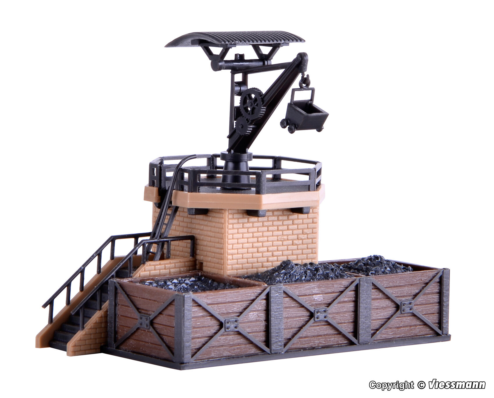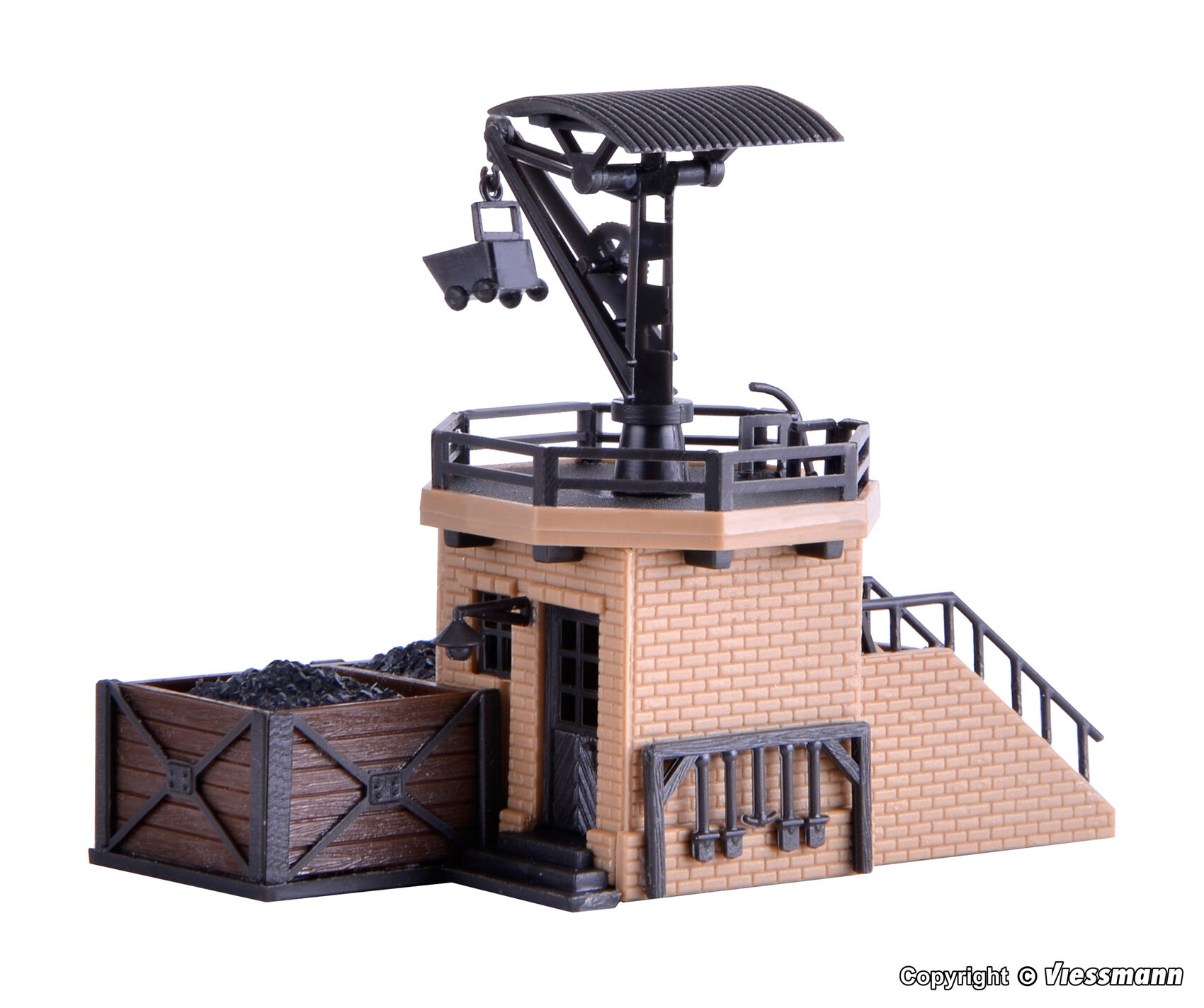 Hier dreht sich alles um die Dampflok. An dieser Anlage wird sie mit den nötigen Kohlen beladen. Maße: L 7,5 x B 4,5 x H 6 cm.