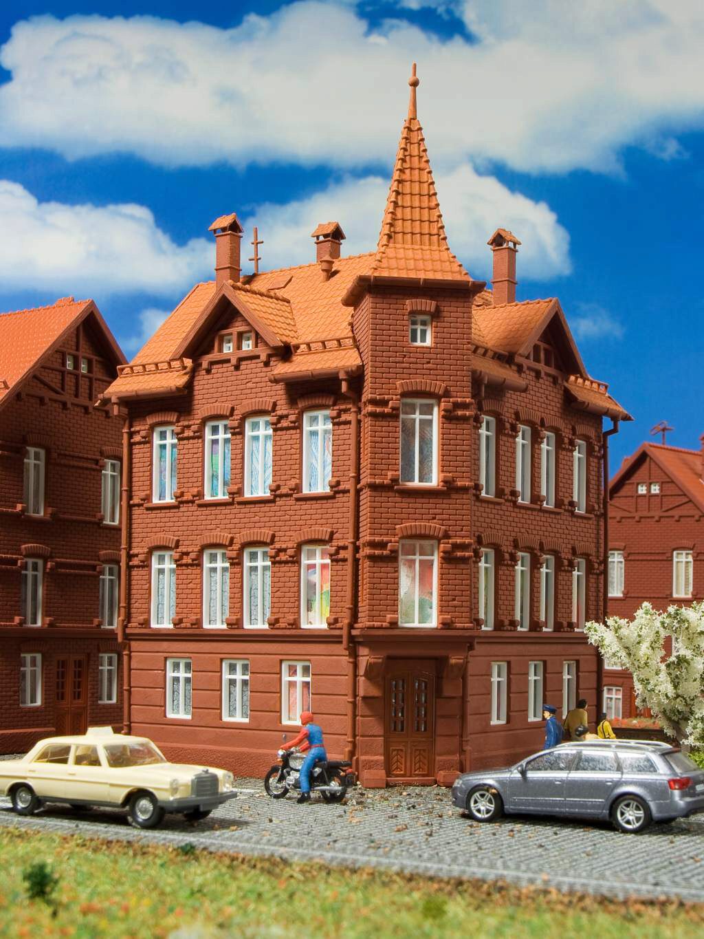 Die Eisenbahner-Wohnhäuser sind stattliche Gebäude aus der Zeit um die Wende zum 20. Jahrhundert. Durch die Backsteinbauweise wirken die Häuser rustikal und gleichzeitig spürt man die Romantik des Industriezeitalters. Die günstigen Wohnungen für Bahnangestellte waren und sind in der Nähe der Gleisanlage positioniert. Der Backstein ist nicht nur in Norddeutschland zu Hause, sondern wurde aufgrund der hohen Beanspruchbarkeit überall eingesetzt. Mit den Wohnhäusern Art. 47636, 47640 und 47641 können interessante Eisenbahner-Wohnviertel gestaltet werden. Maße: L 8,6 x B 8,6 x H 12 cm.