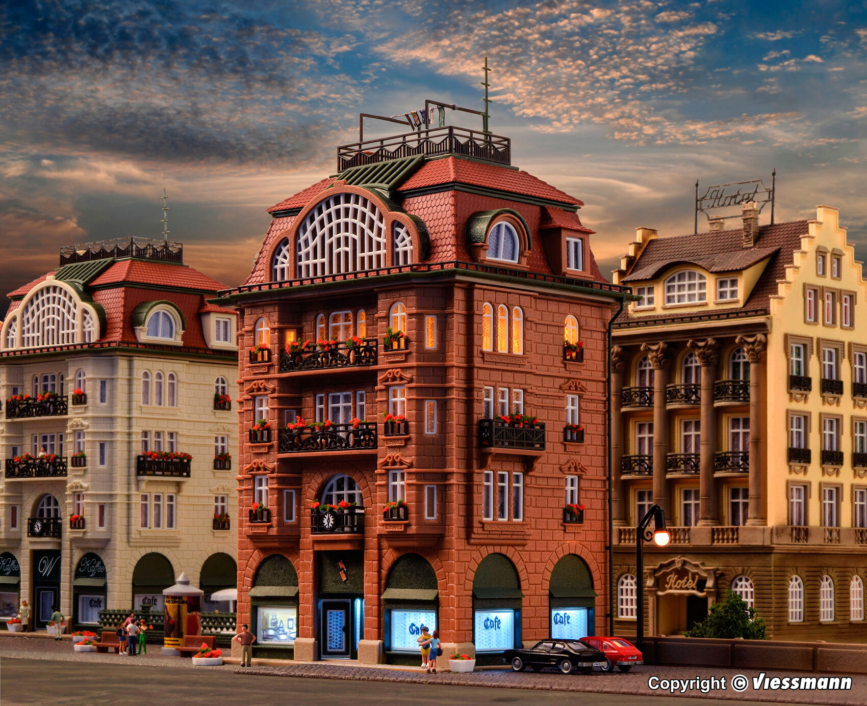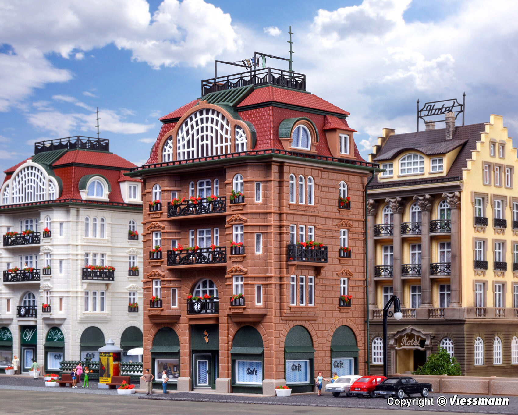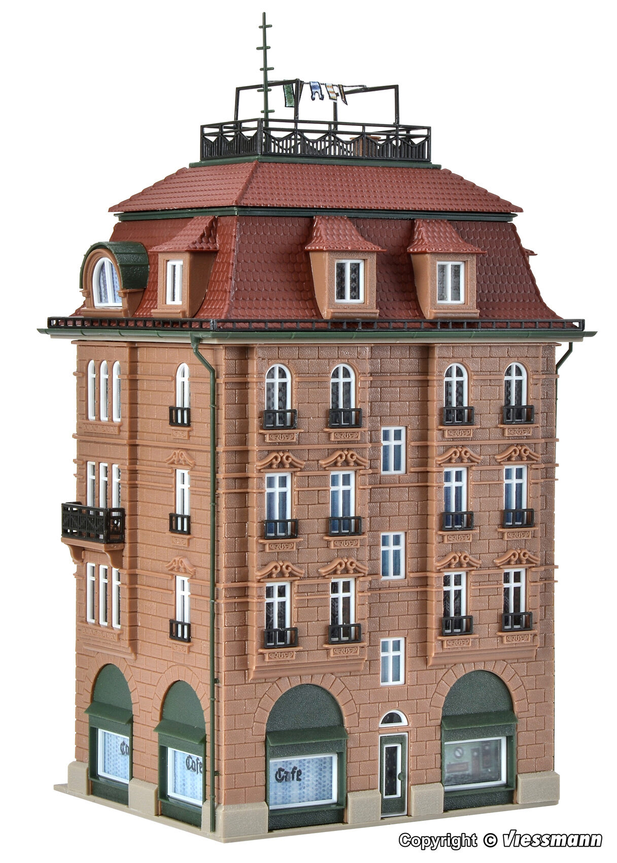 Dieses Modell ist so konstruiert, dass jede Seite eine Sichtseite darstellt. So können Sie z. B. 2 Häuser direkt nebeneinander stellen und sie wirken doch verschieden. Mit den beiliegenden Blendstücken können Sie die Seiten so verkleiden, dass ein anderes Gebäude direkt angebaut werden kann. Maße: L 9,8 x B 7,9 x H 16 cm.