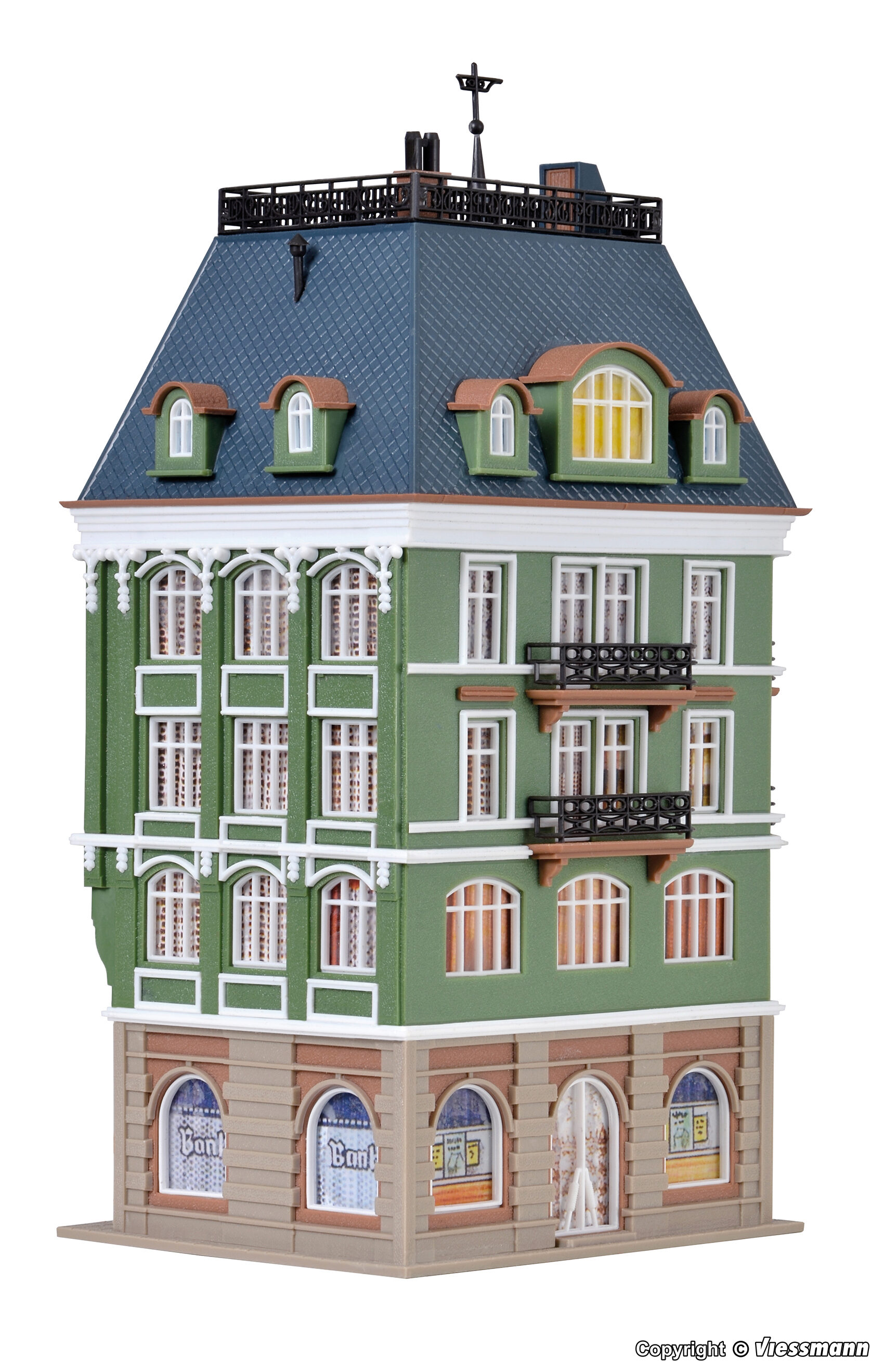 Dieses Modell ist so konstruiert, dass jede Seite eine Sichtseite darstellt. So können Sie z. B. 2 Häuser direkt nebeneinander stellen und sie wirken doch verschieden. Das Gebäude ist mit vielen Details ausgestattet, z. B. Eisengitterverzierungen, zierlichen Balkonen, Stuckfassaden und vielem mehr. Mit den beiliegenden Blendstücken können Sie die Seiten so verkleiden, dass ein anderes Gebäude direkt angebaut werden kann. Maße: L 8,5 x B 7,5 x H 18 cm.