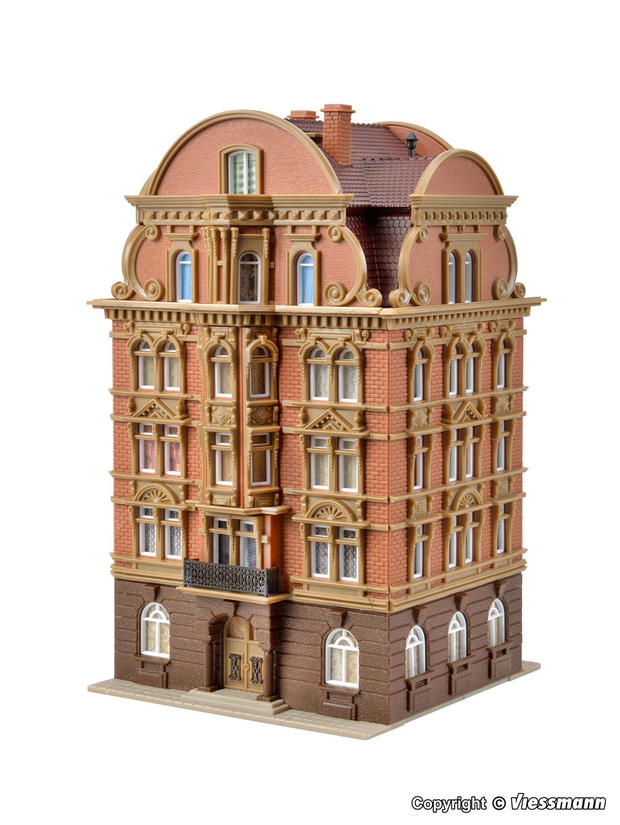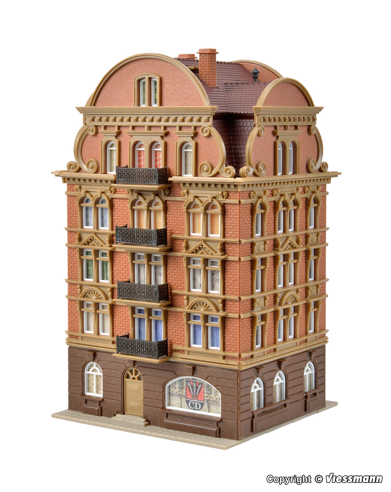 Dieses Modell ist so konstruiert, dass jede Seite eine Sichtseite darstellt. So können Sie z. B. 2 Häuser direkt nebeneinander stellen und sie wirken doch verschieden. Das Gebäude ist mit vielen Details ausgestattet, z. B. Eisengitterverzierungen, zierlichen Balkonen, Stuckfassaden und vielem mehr. Maße: L 9,5 x B 8,8 x H 14,8 cm.