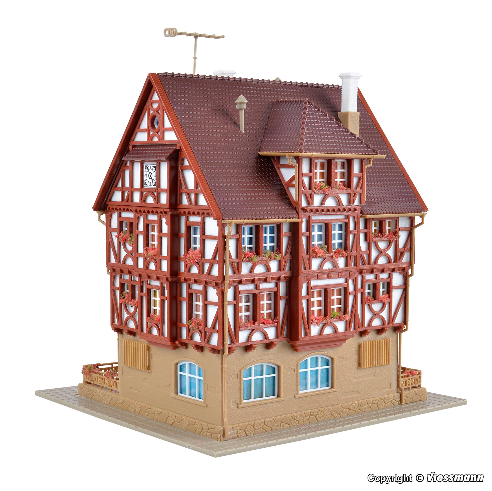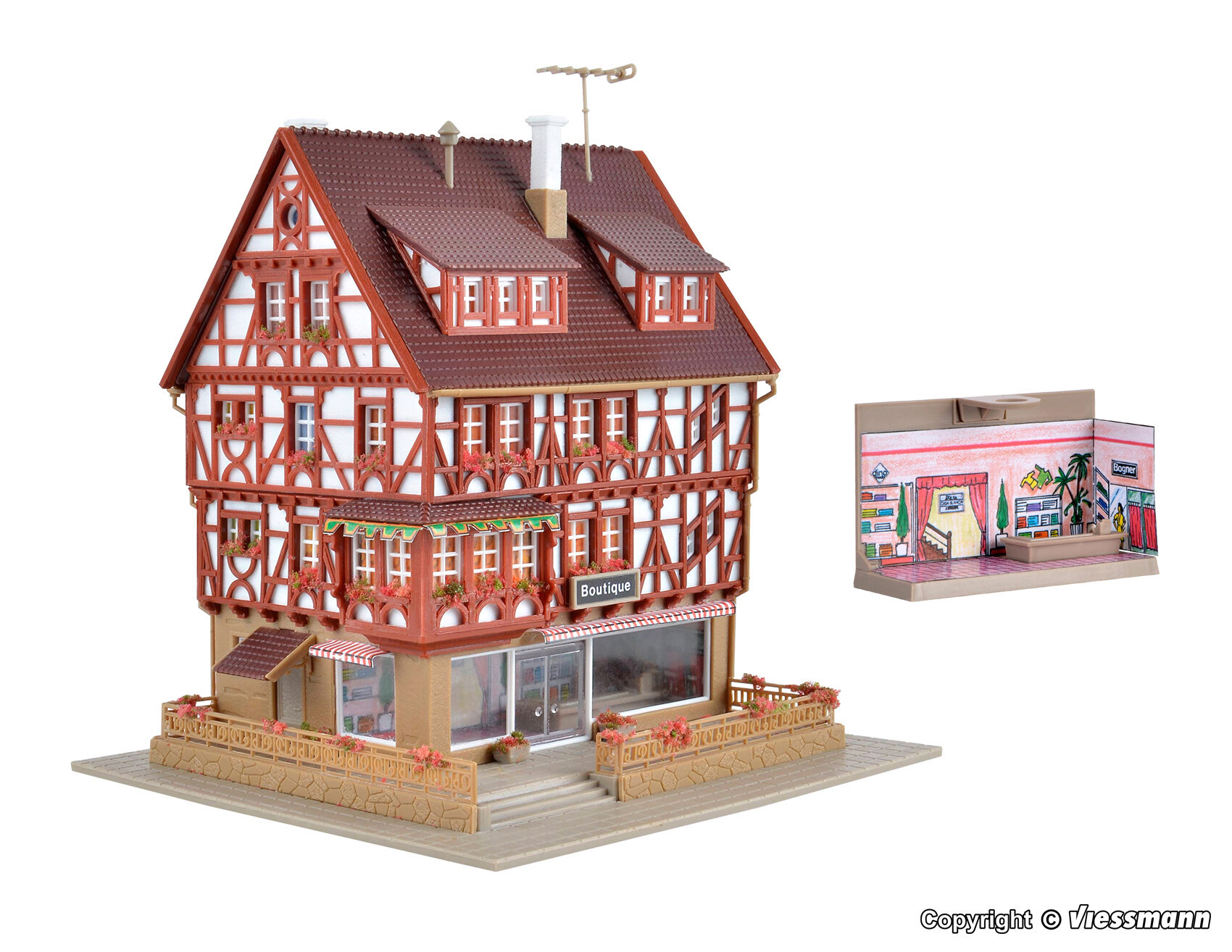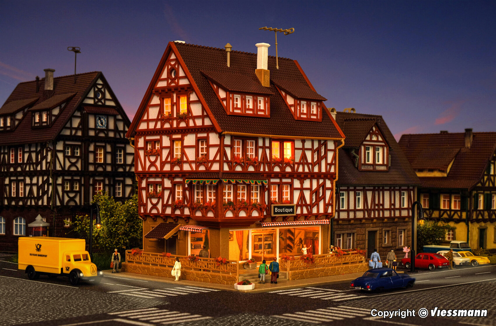 In diesem romantischen Fachwerkhaus befinden sich in den oberen Etagen Wohnräume und in der unteren Etage eine kleine Boutique mit großen Schaufenstern. Die beiliegende Beleuchtung setzt die Ladeneinrichtung ins rechte Licht. Maße: L 11,3 x B 11 x H 12 cm.