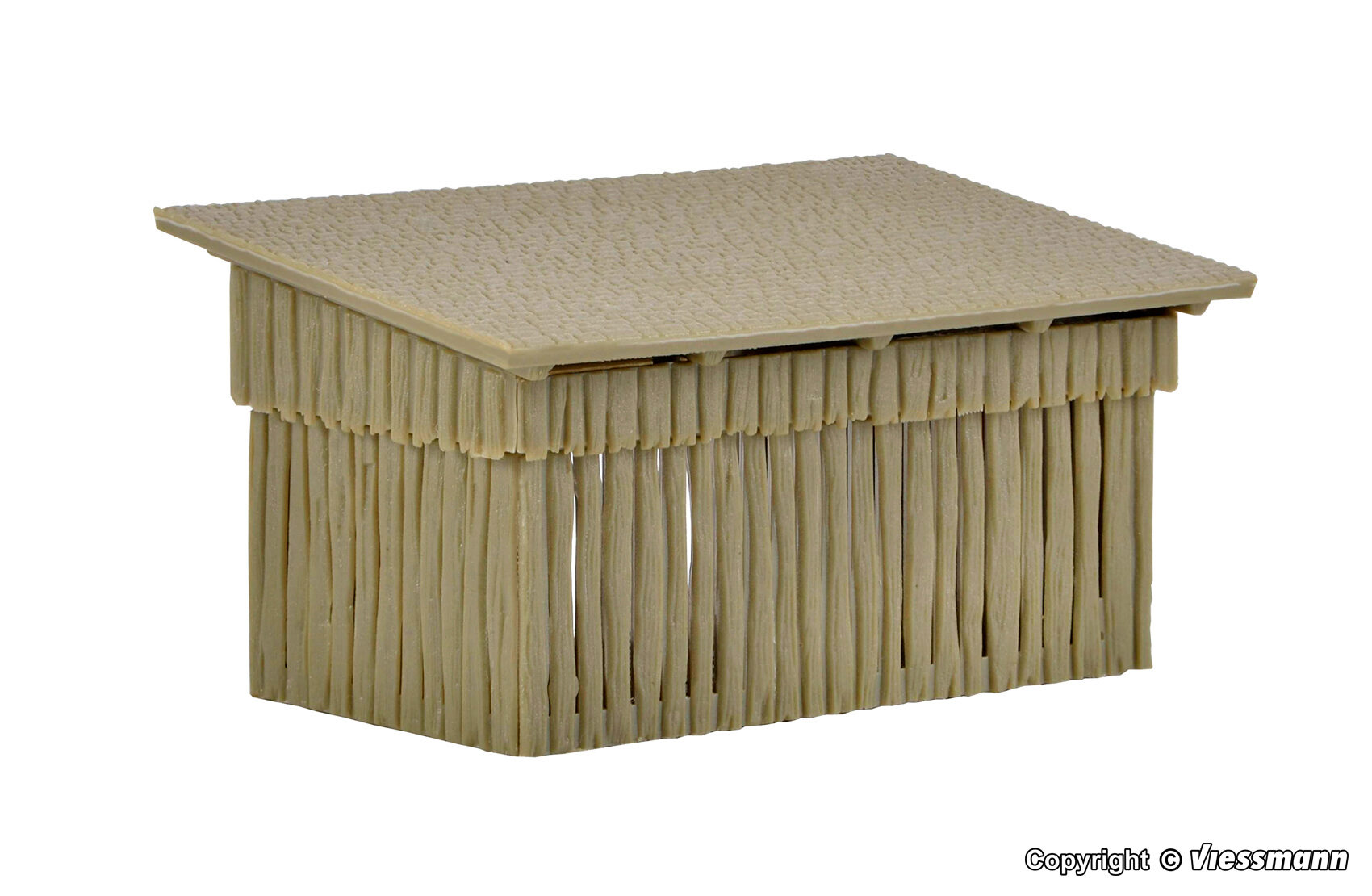 Dieser kleine Viehunterstand passt gut zu einem landwirtschaftlichen Betrieb. Maße Zaun: L 8 x B 8 x H 1 cm (4 x), Unterstand: L 5,5 x B 3,5 x H 2,8 cm.