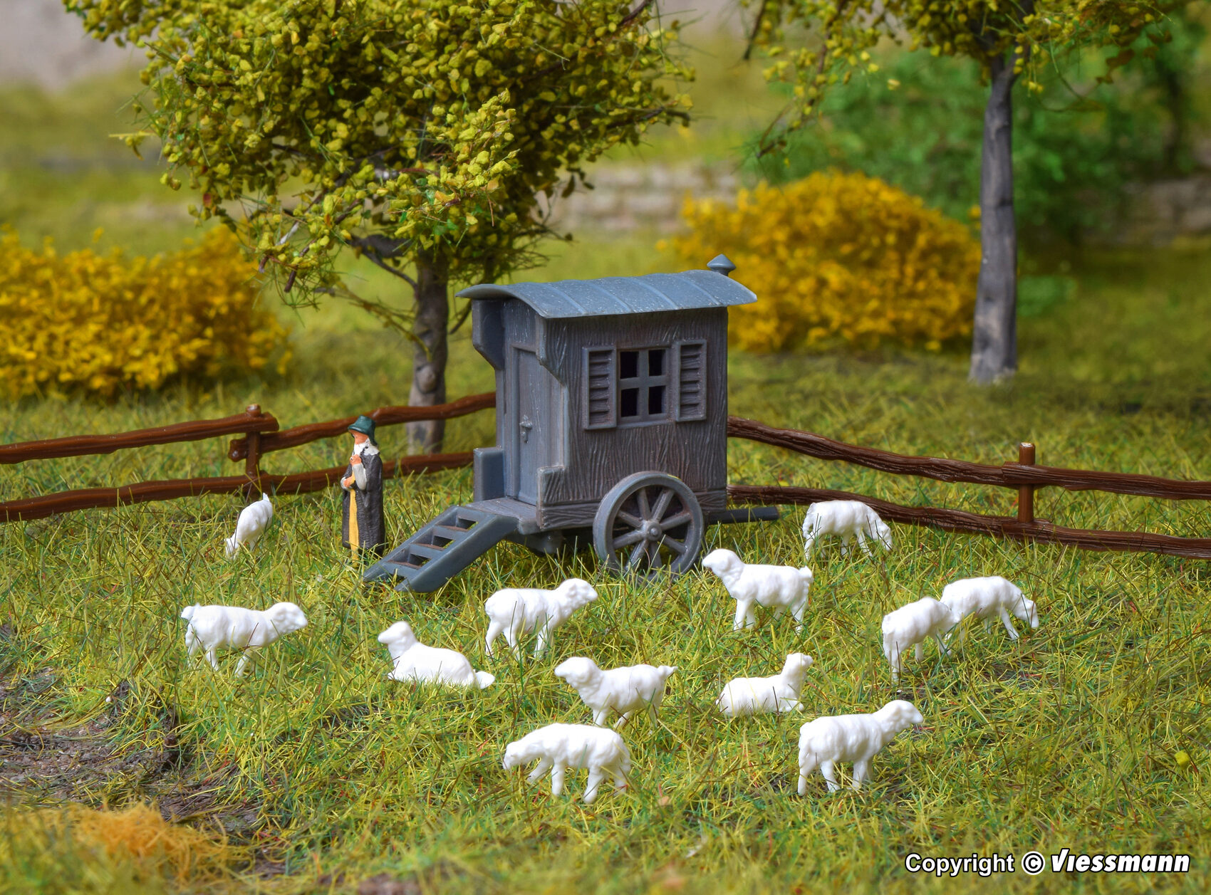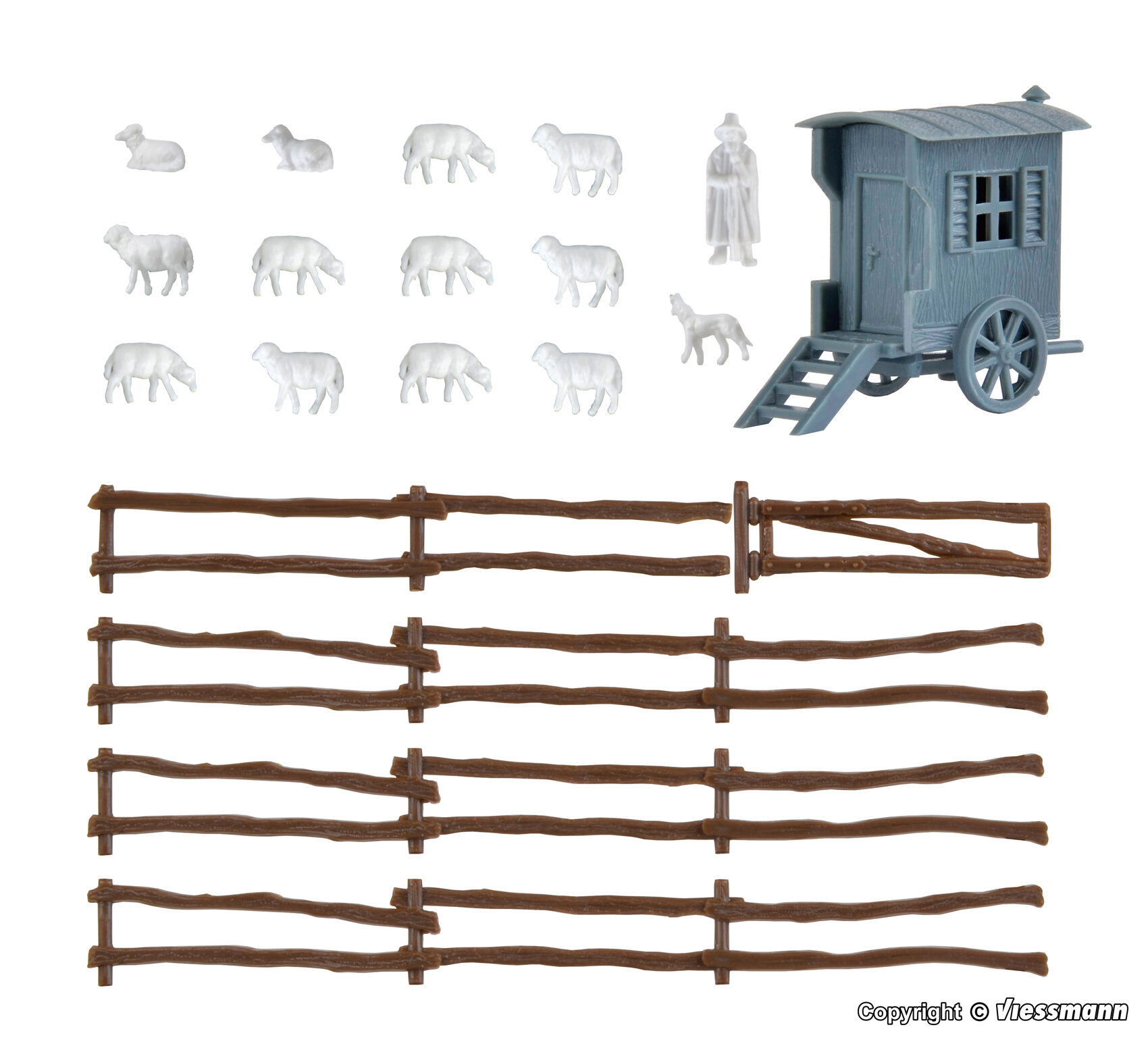 Dem Bausatz liegen 12 Schafe, ein Schäfer, ein Zaun und ein Hund bei. Maße: Schäferwagen: L 3,5 x B 1,5 x H 2,5 cm. Zaun: L 32 x B 0,1 x H 1 cm.