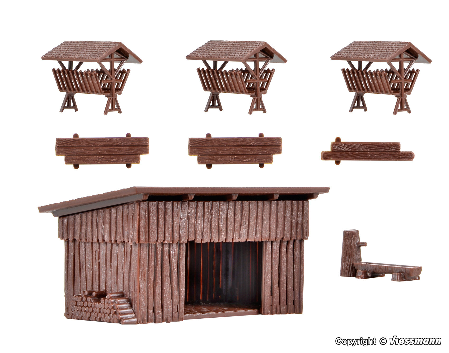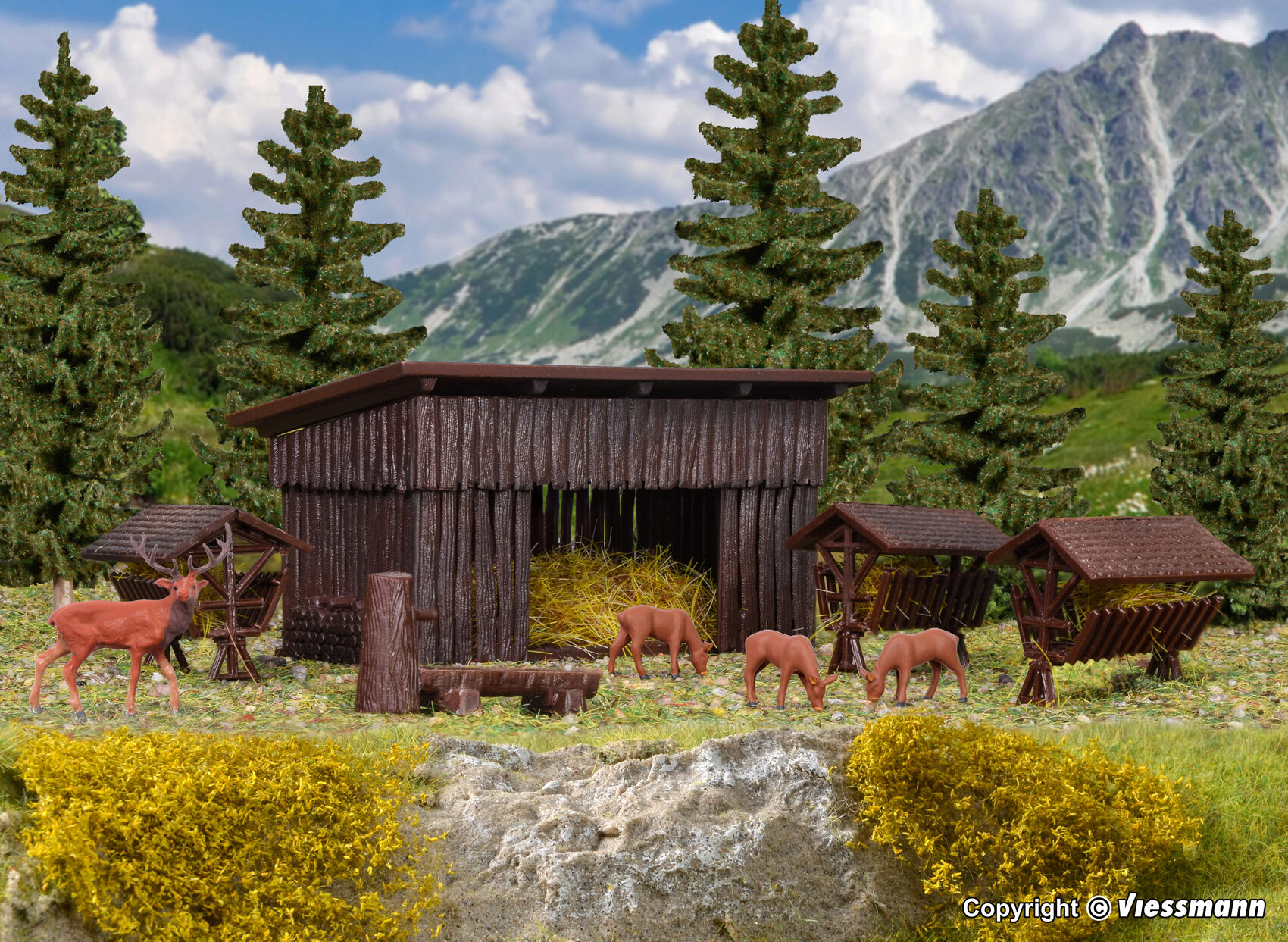 Der Bausatz besteht aus der Scheune und 3 Futterraufen. Maße: Scheune: L 5,5 x B 3,5 x H 2,8 cm. 3x Futterraufe: L 1,7 x B 1,4 x H 1,5 cm. Wassertrog: L 2 x B 0,8 x H 1 cm.