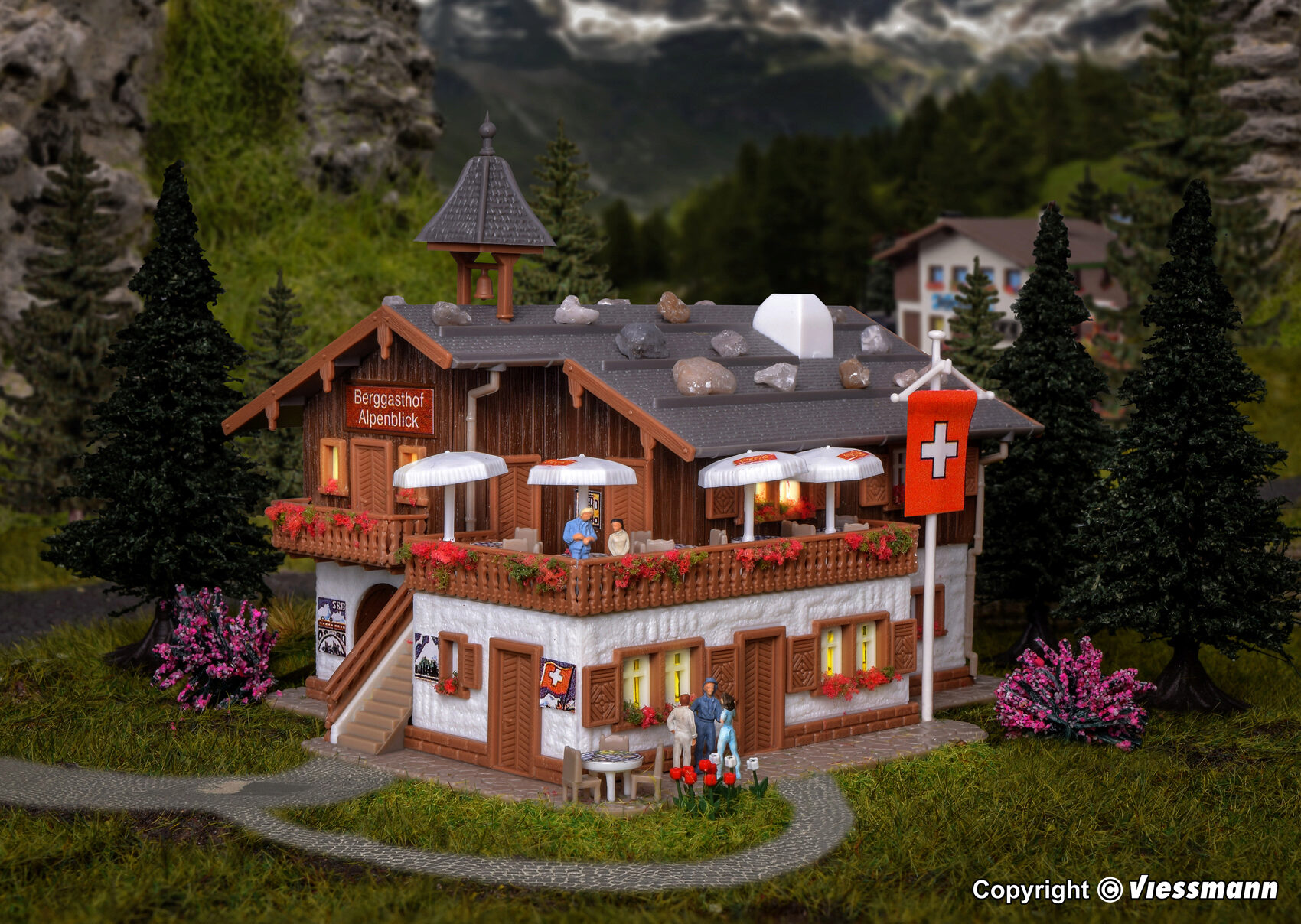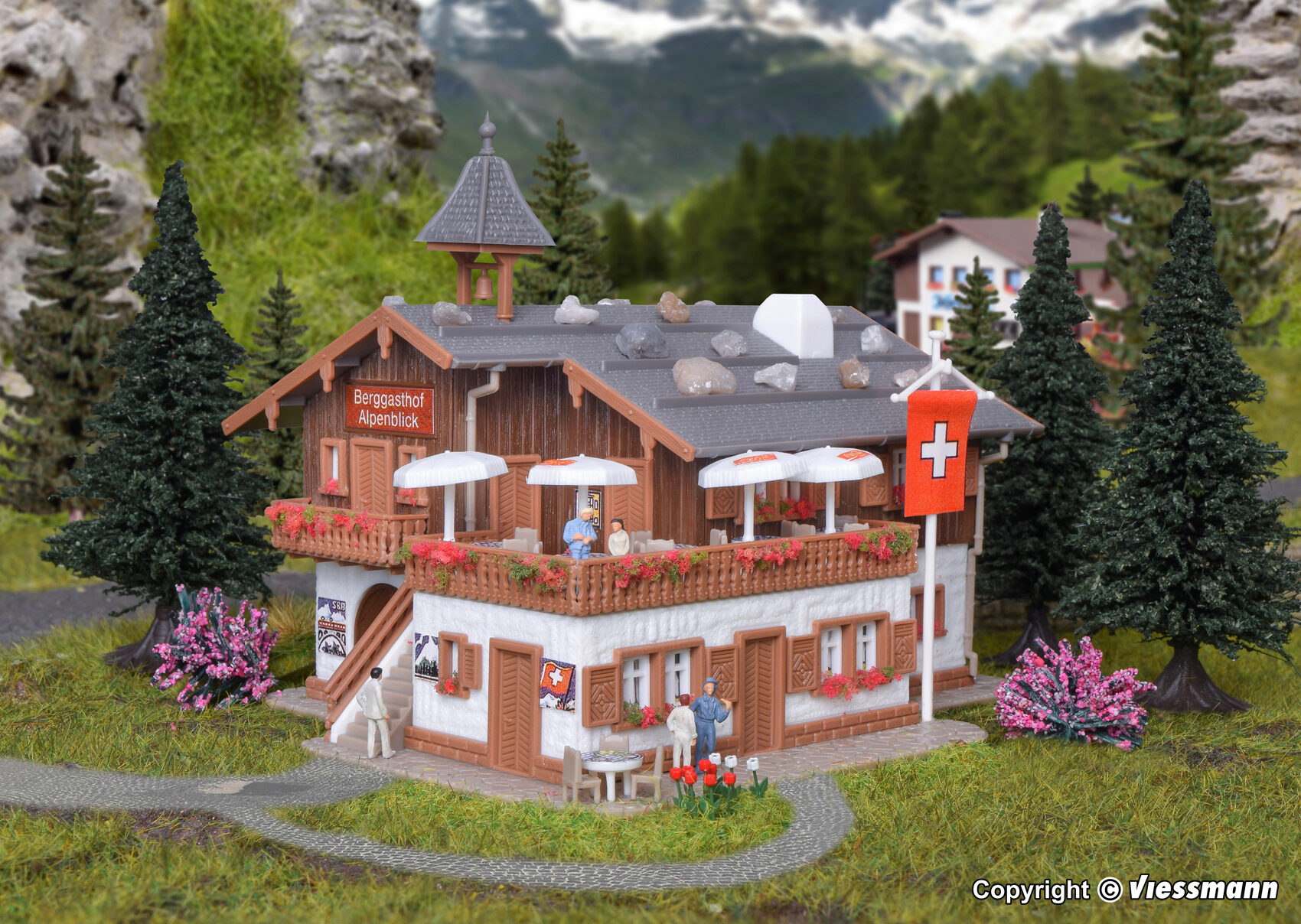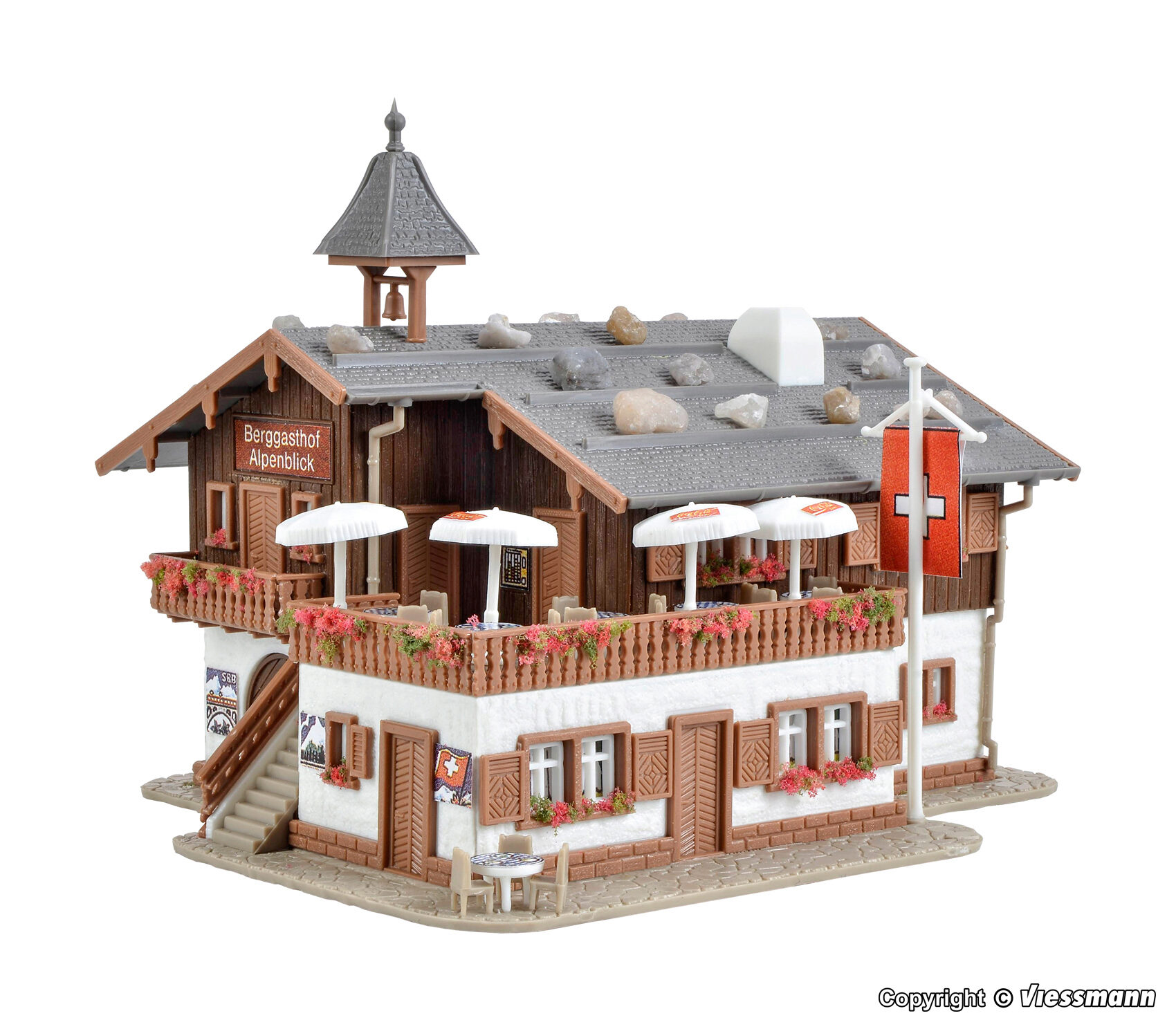 Zaubern Sie sich die Idylle der alpenländischen Bergwelt auf Ihre Modellanlage. Das schweizerische Bergrestaurant aus der Zermatter Gegend ist eine der besten Voraussetzungen dafür. Maße: L 11,5 x B 9,5 x H 8,5 cm.