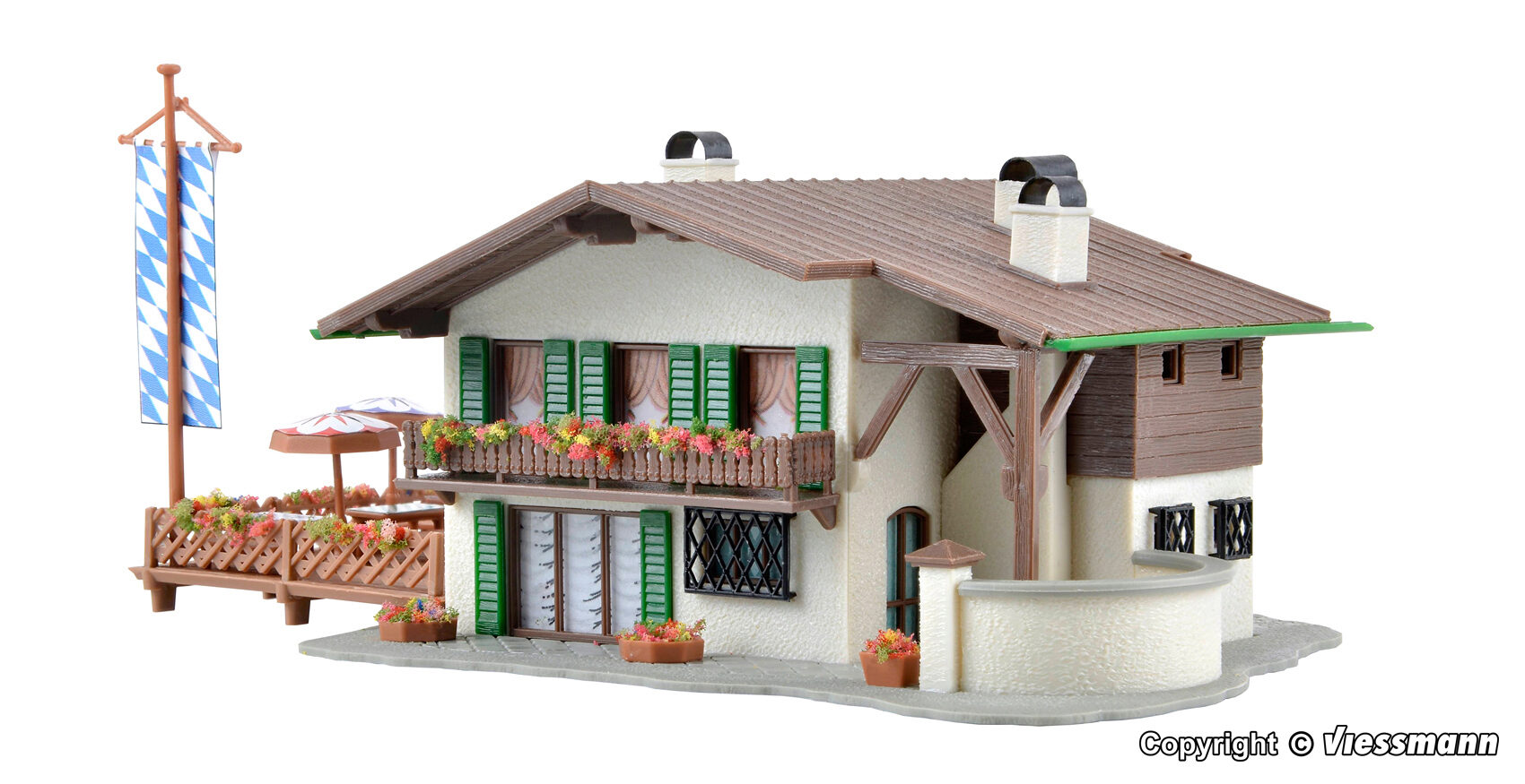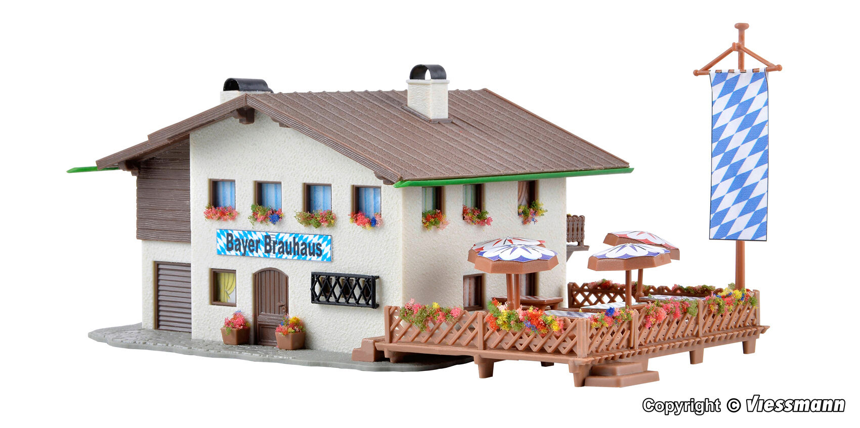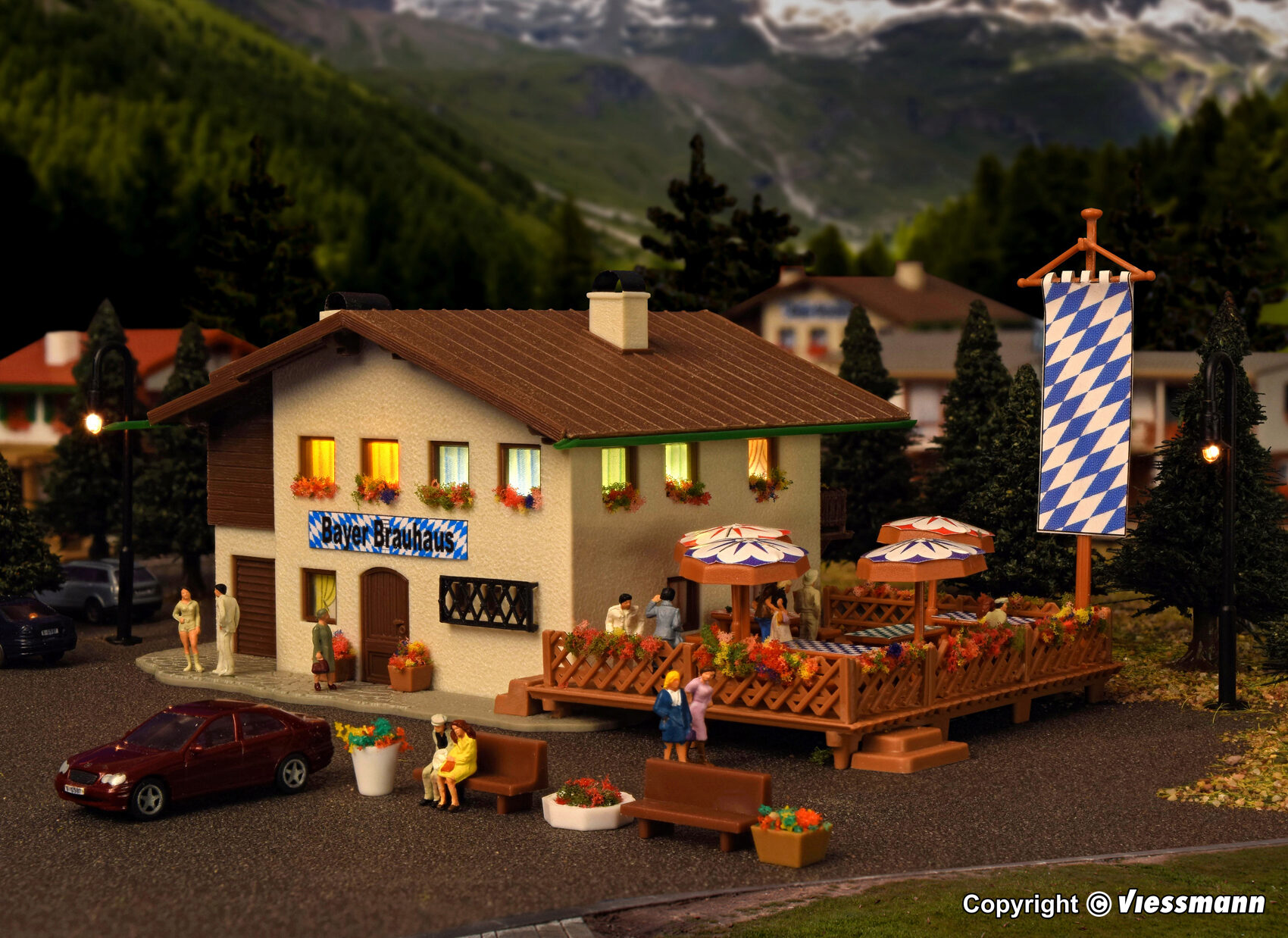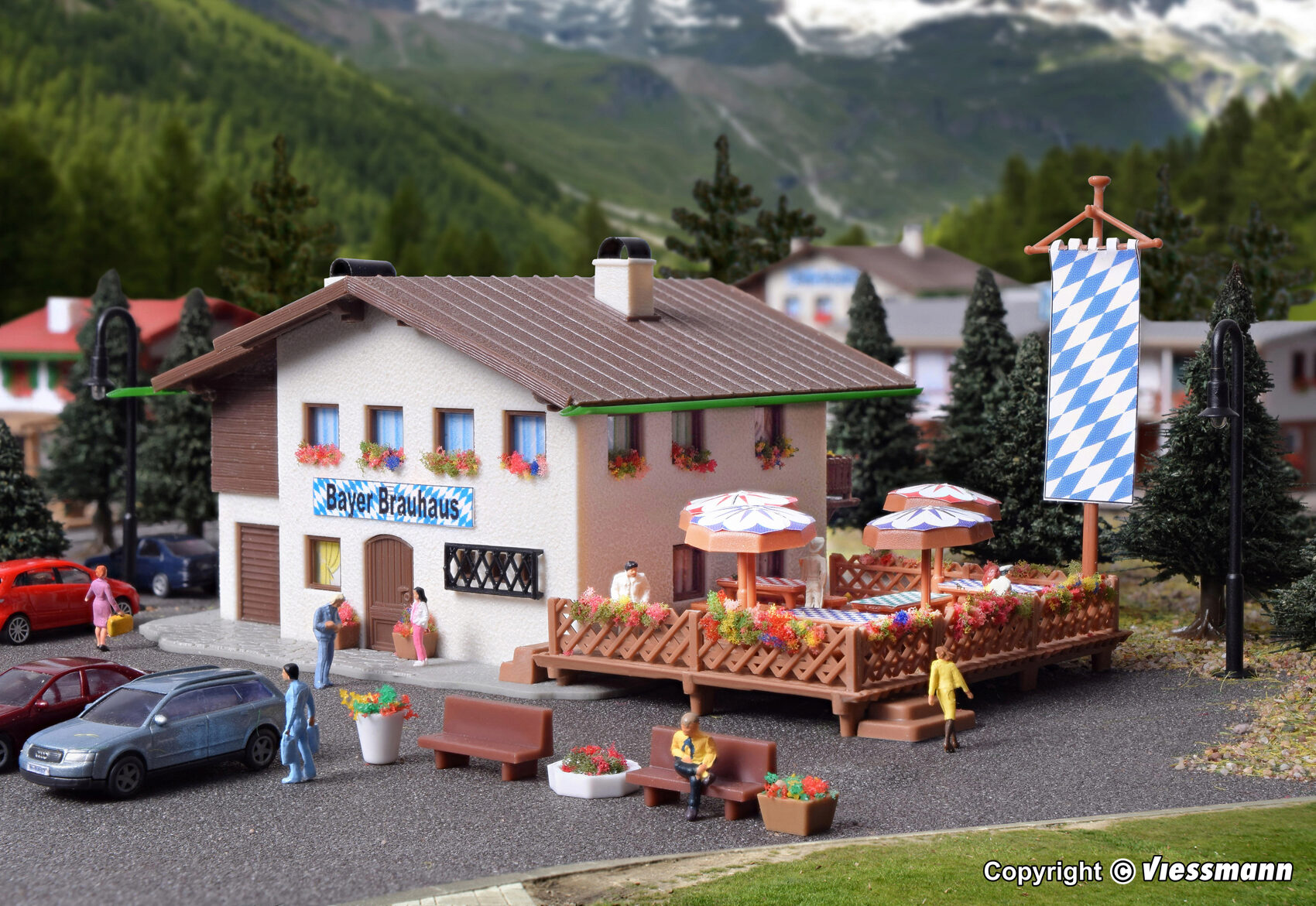 Mit Außenterrasse, Tischen, Bänken, Sonnenschirmen und Fahne. Maße: L 10 x B 8,5 x H 5,5 cm. Terasse: L 6 x B 5,5 x H 6 cm.