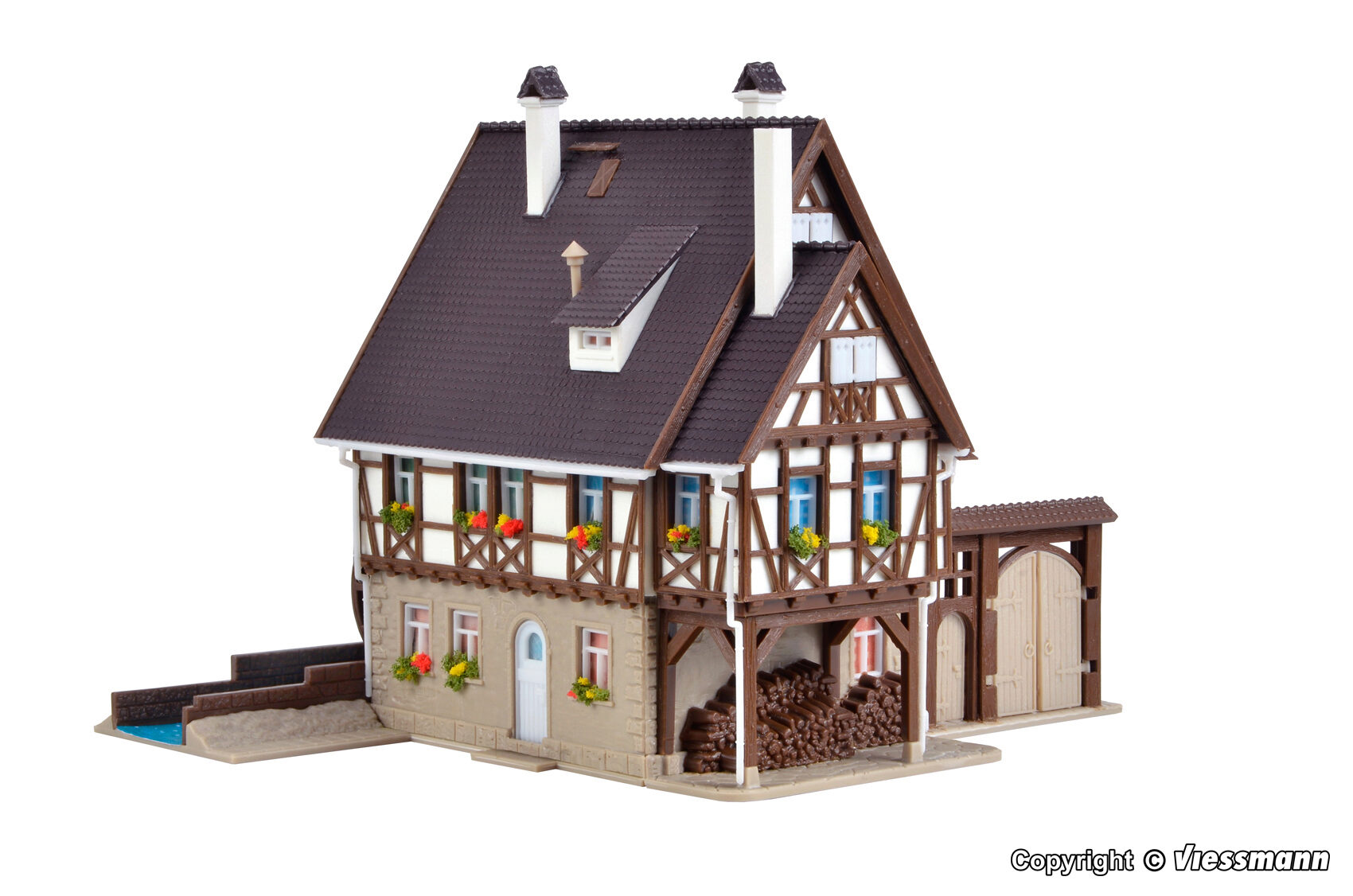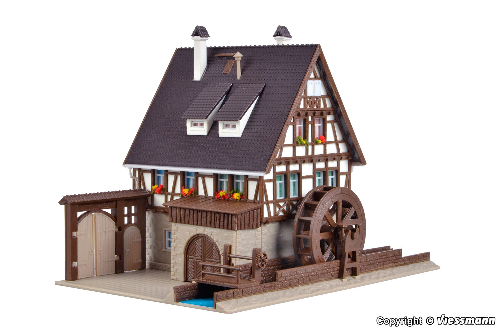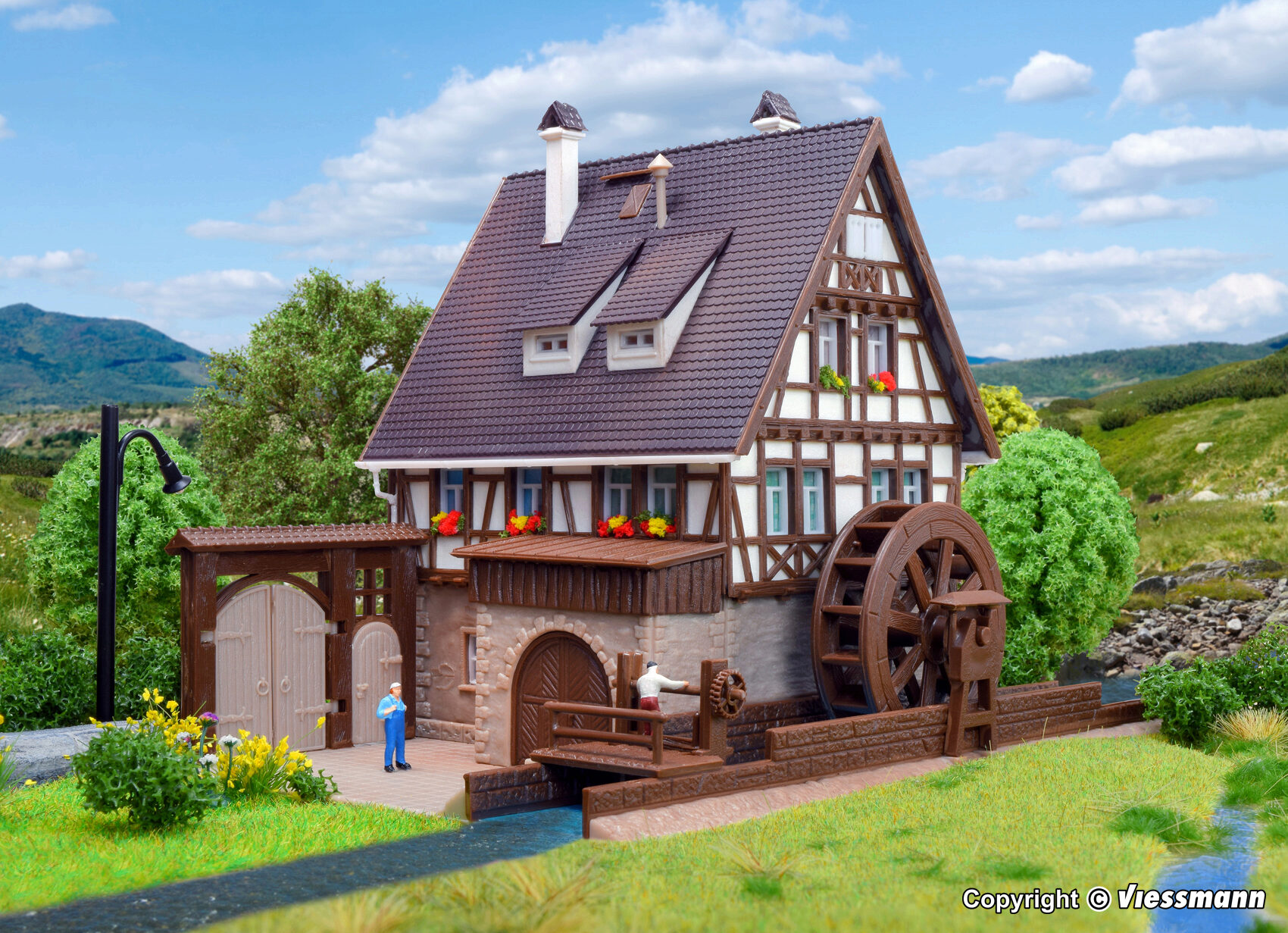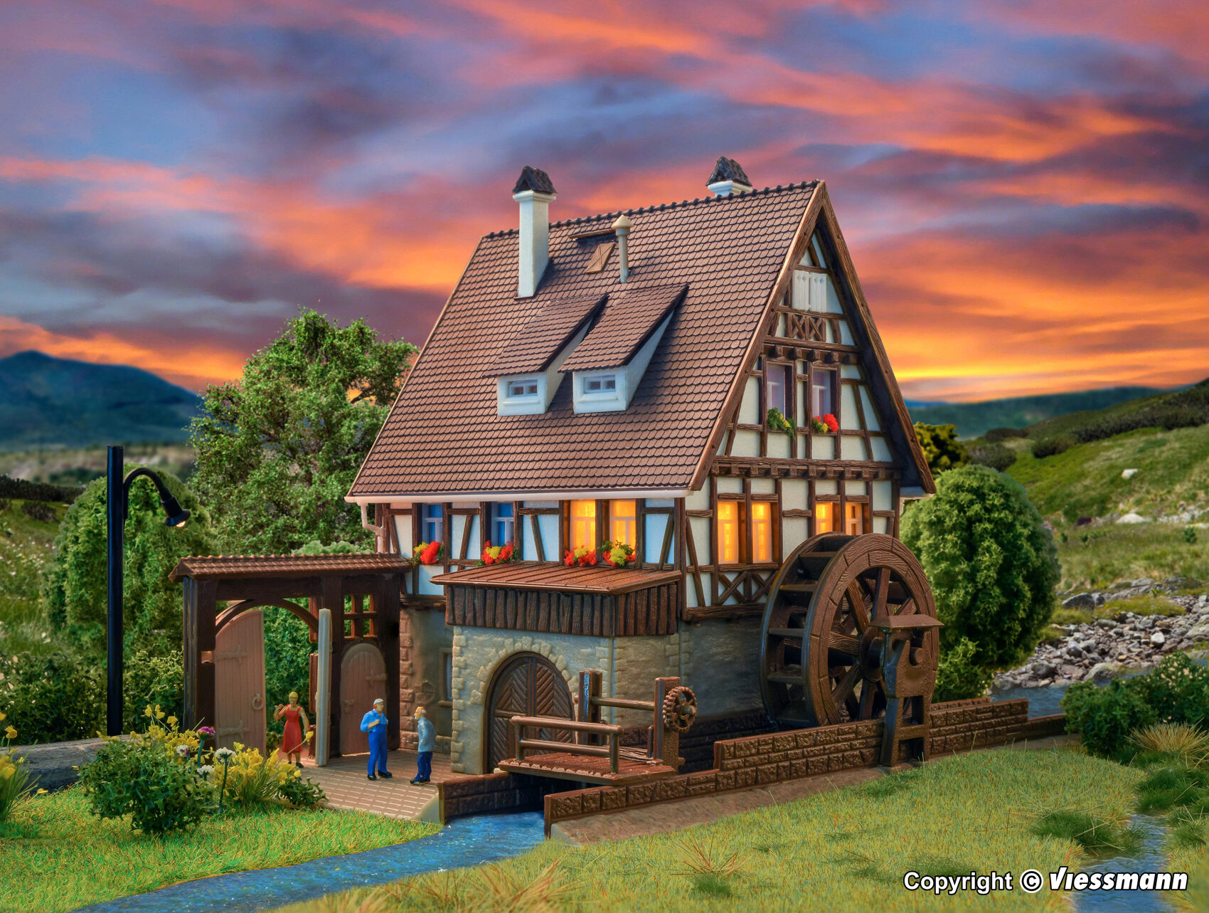 Die fachwerkverzierte Getreidemühle mit Mühlrad und Hoftor liegt an einem kleinen Flüsschen. Sie können wählen, in welcher Epoche sie dieses Thema ansiedeln. Das Mühlrad kann mit dem Motor Art. 44200 angetrieben werden (Zusatzausstattung). Maße: L 14 x B 11,5 x H 10,5 cm.
