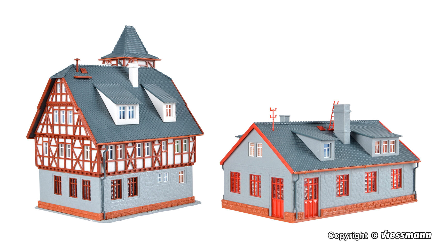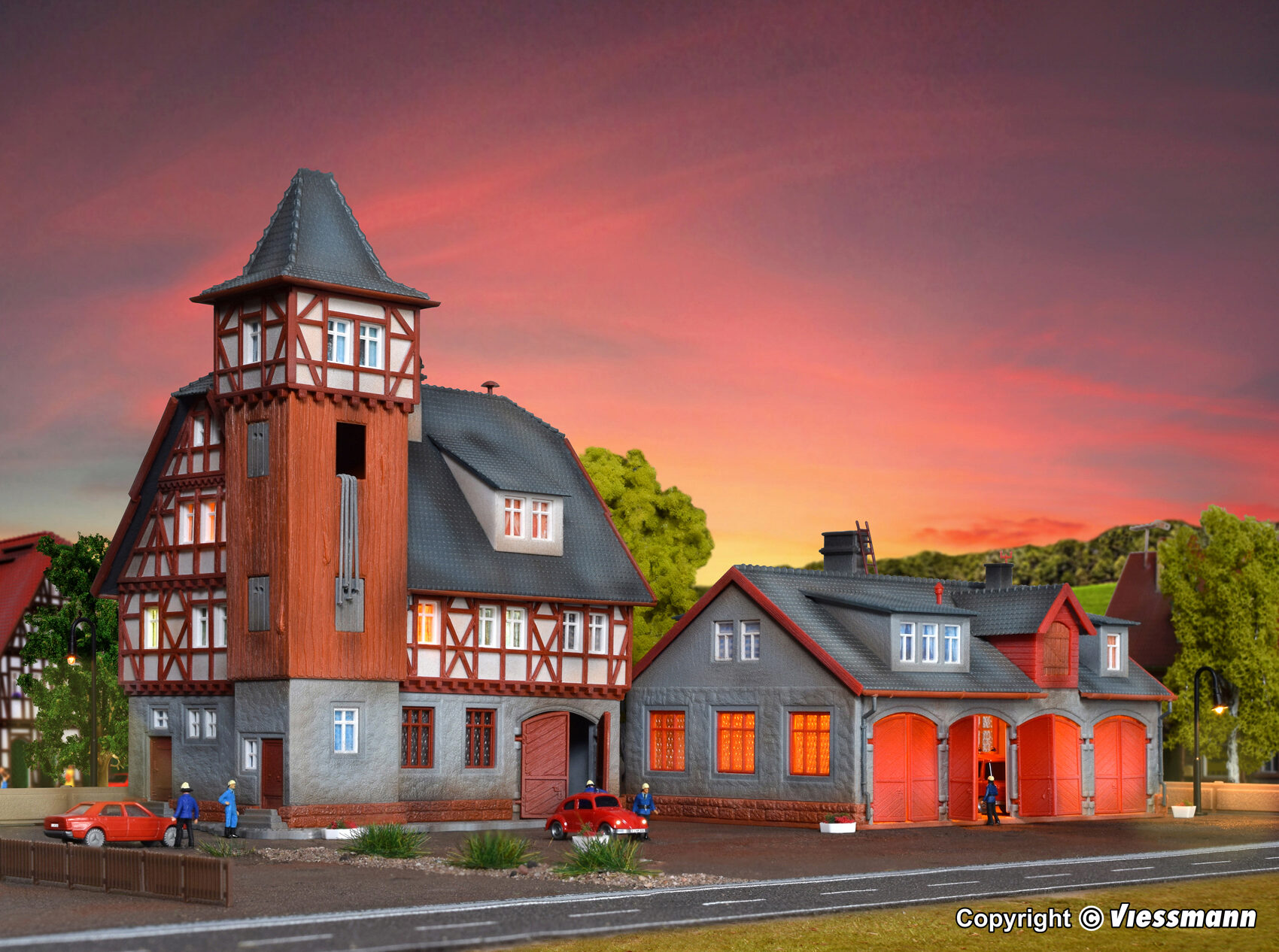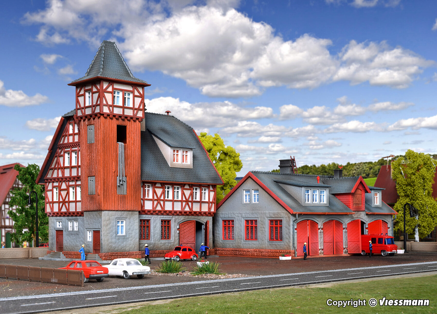 Ein solcher Stützpunkt ist auch heute noch in vielen Kleinstädten zu finden. Hinter den roten Doppeltoren finden bis zu 5 Einsatzfahrzeuge Platz. Der holzverkleidete Schlauchturm dient zum Trocknen der Schläuche nach dem Einsatz. Maße: L 25 x B 9,5 x H 14,5 cm.