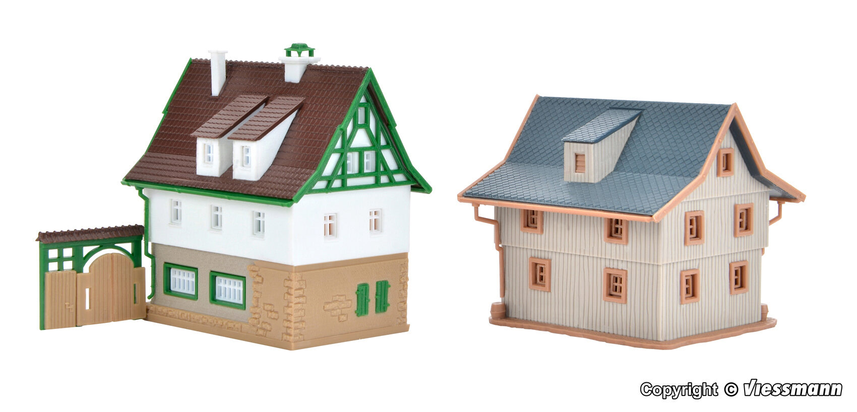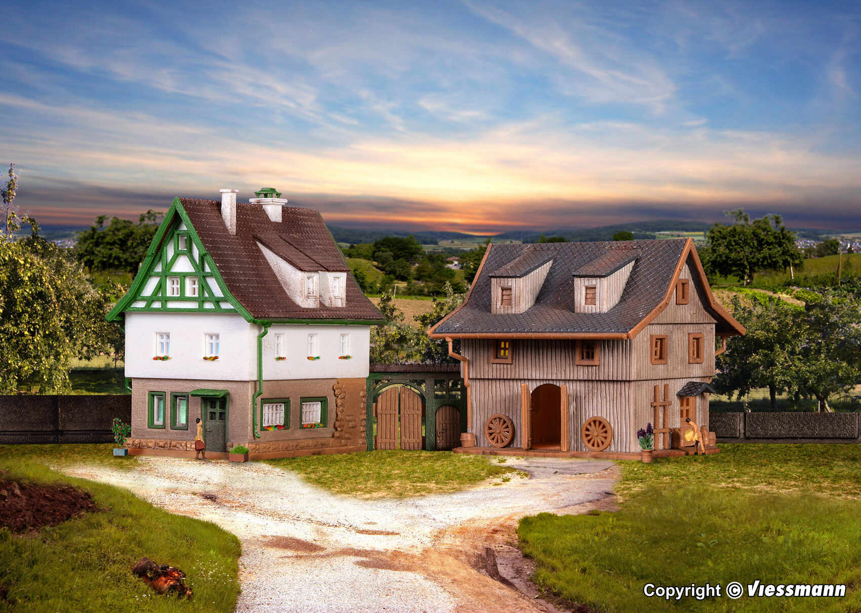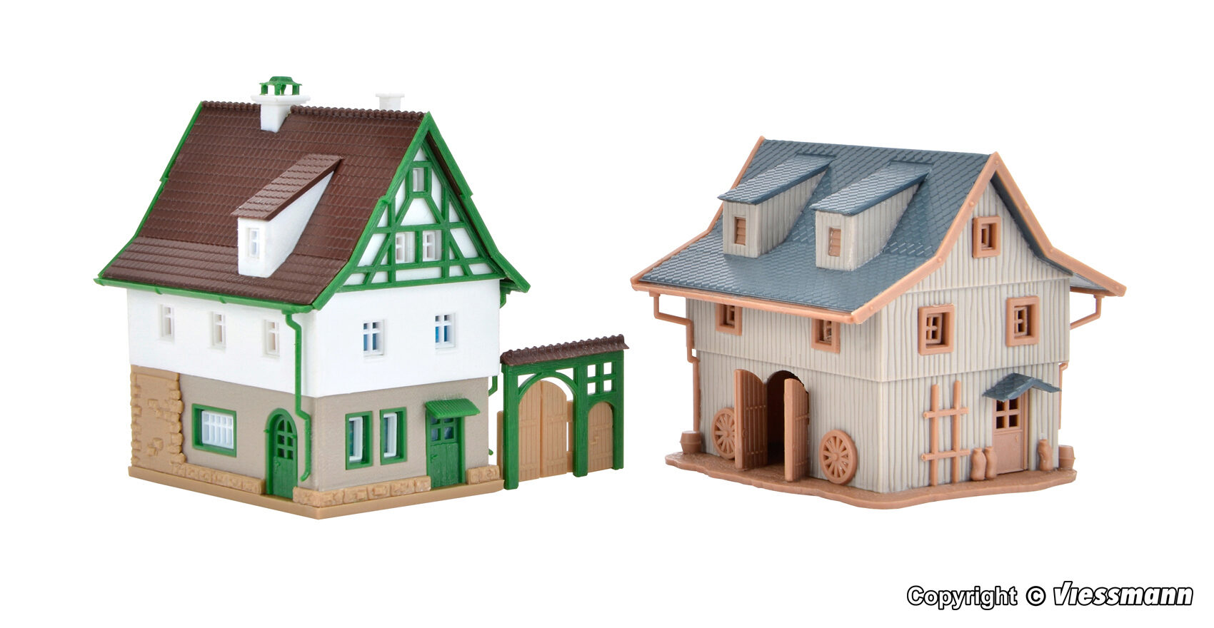 Maße: Haus L 5 x B 3,8 x H 5,5 cm, Scheune L 5 x B 4,8 x H 4,5 cm, Hoftor L 2,3 x B 0,3 x H 1,9 cm.