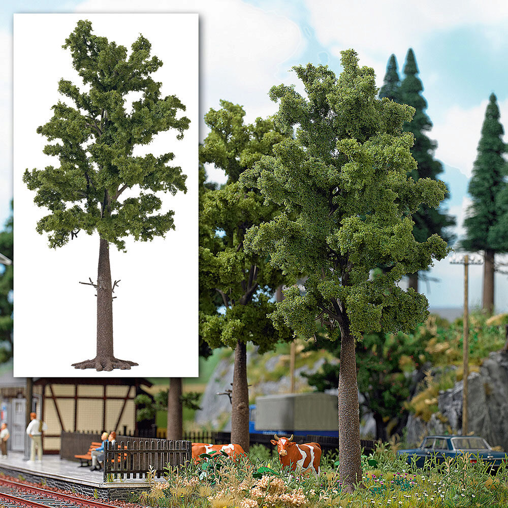 Der Laubbaum besteht aus einem Kunststoffgeäst, das gebogen und beflockt ist. Die Oberflächen der Stämme werden aber speziell behandelt, so dass vom Kunststoff nichts mehr zu sehen ist. Die raue Struktur simuliert perfekt die Rindenstruktur der großen Vorbilder aus der Natur. Außerdem werden die Äste mit unterschiedlichen Materialien mehrfach beflockt, um das Laubbild der Natur perfekt nachzuahmen.