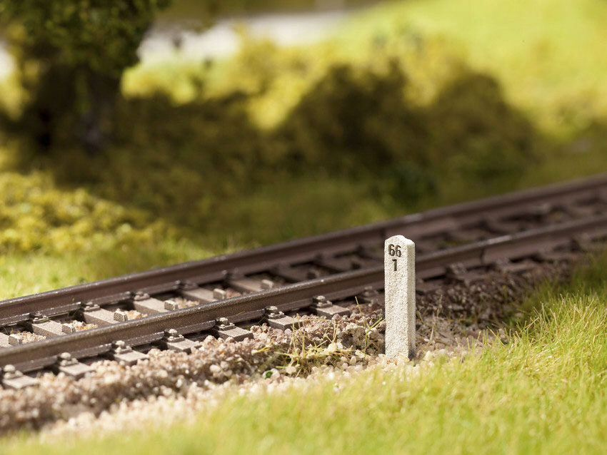 Die NOCH "Kilometersteine" eignen sich ideal dafür, um jede Zugstrecke einer Modellbahnlandschaft mit noch mehr realisitschen Details auszugestalten. Die Kilometersteine stehen hauptsächlich entlang nicht elektrifizierter Nebenbahnstrecken. Die obere Zahl zeigt den Streckenkilometer an, die untere die 100-Meter-Marke. So steht z.B. 66 /1 für den Kilometer 66,1. Wie auf einer Bahnstrecke in der Realität können Sie die Streckenkilometer auf Ihrer Modellanlage nun auch grafisch darstellen und mit kleinen Details noch wirklichkeitsgetreuere Ergebnisse erhalten. Der Zug fährt die Passanten an ihr Ziel. Ob auf einer Geschäftsreise, einen Besuch bei den Liebsten oder um einen schönen Ausflug zu machen - der Zug ist ein sehr beliebtes Nutzfahrzeug. Jede Modelllandschaft erhält durch individuell gestaltete Zugstrecken ein noch realistischeres Aussehen. Kleine Details wie die "Kilometersteine" verwirklichen den naturgetreuen Anblick noch mehr. Gestalten Sie Ihre Modelllandschaft mit noch mehr Details aus und setzten Sie diese so gekonnt in Szene.