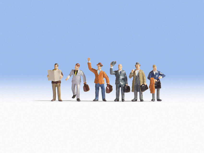 Alle Reisende sind wie typische Geschäftsmänner bekleidet: Sie tragen Kombinationen aus Hosen und Sakko oder Anzüge und haben Aktentaschen in der Hand. Ein Mann liest stehend die Zeitung. Ein weiterer Mann geht im grauen Anzug über den Bahnsteig. Ein Mann im braunen Sakko winkt, oder ruft er vielleicht ein Taxi? Ein älterer Herr im grauen Anzug grüßt indem er den Hut hebt. Ein Herr im blauen Sakko schaut ungeduldig auf die Uhr. Die Modellfiguren sind ideal für die Ausgestaltung von Bahnhofs- und Bahnsteigszenen auf Modellbahnanlagen geeignet.
