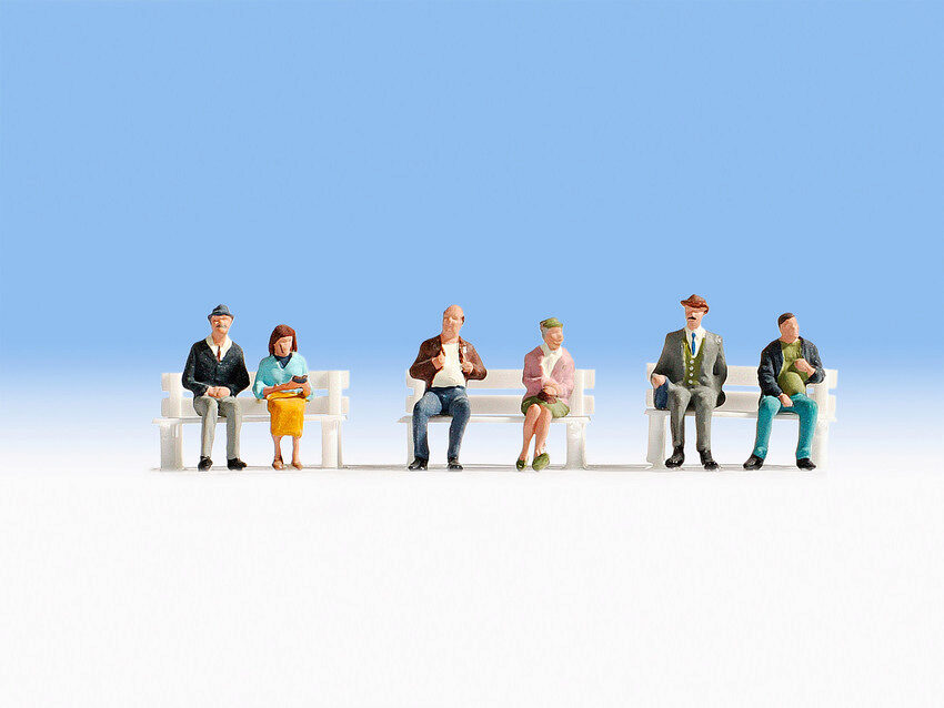 Das Set "Fahrgäste" in der Spur H0 beinhaltet zwei weibliche Figuren und vier männliche Figuren, jeweils in einer sitzenden Position. Aufgrund dessen, dass das Set ohne Bänke verschickt wird, sind die Figuren vielseitig einsetzbar: auf Bahnsteigen, Wartebereichen oder Bushaltestellen. Die Figuren sind detailreich handbemalt und unterschiedlich gekleidet: Einige tragen Anzug oder Kostüm, während andere in Freizeitkleidung erscheinen.