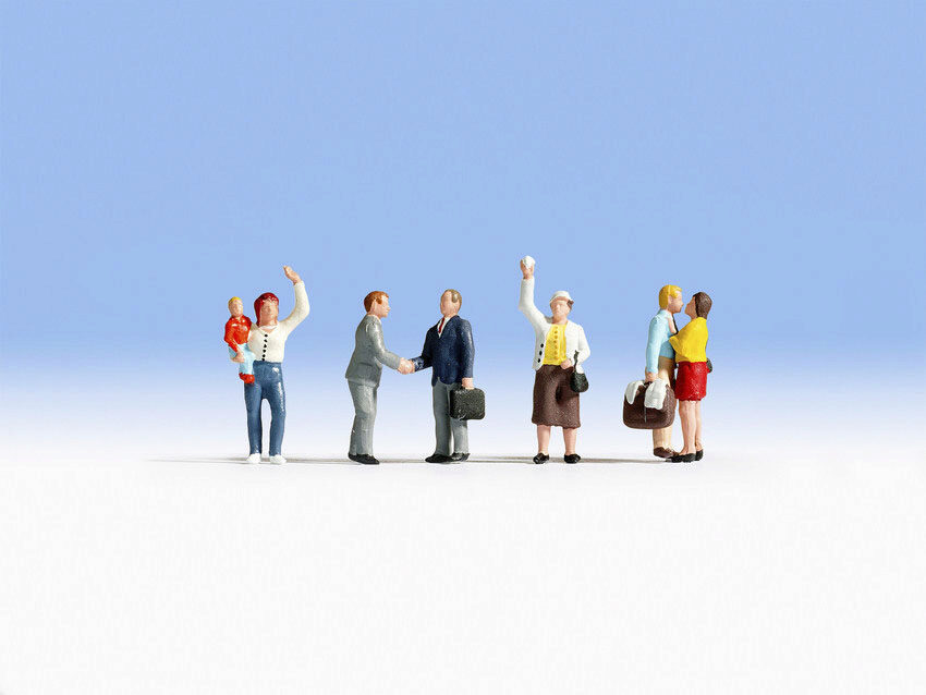 Alle Figuren stellen eine Abschiedsszene dar: Eine Mutter mit Baby auf dem Arm winkt dem Zug nach. Ein Geschäftsmann in grauem Anzug verabschiedet sich mit einem Handschlag von seinem Geschäftspartner. Eine ältere Dame im braunen Rock und gelber Bluse winkt zum Abschied. Eine jüngere Frau verabschiedet sich mit einem Kuss von ihrem Mann, der einen Koffer trägt. Mit diesen tollen Modellfiguren können Bahnhofsszenen realistisch ausgeschmückt und dekoriert werden. Sie eignen sich perfekt für den Einsatz auf Modelleisenbahnanlagen.