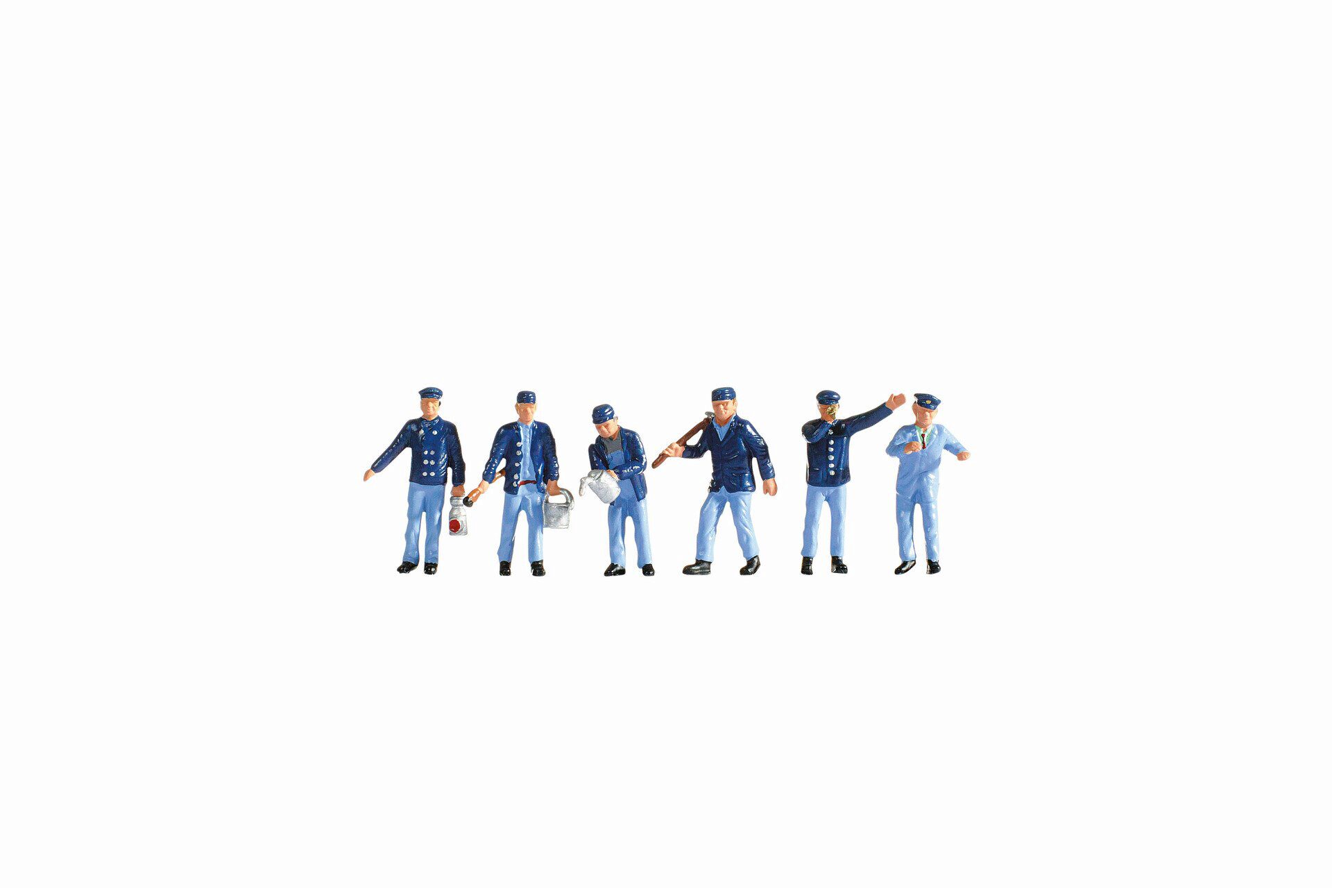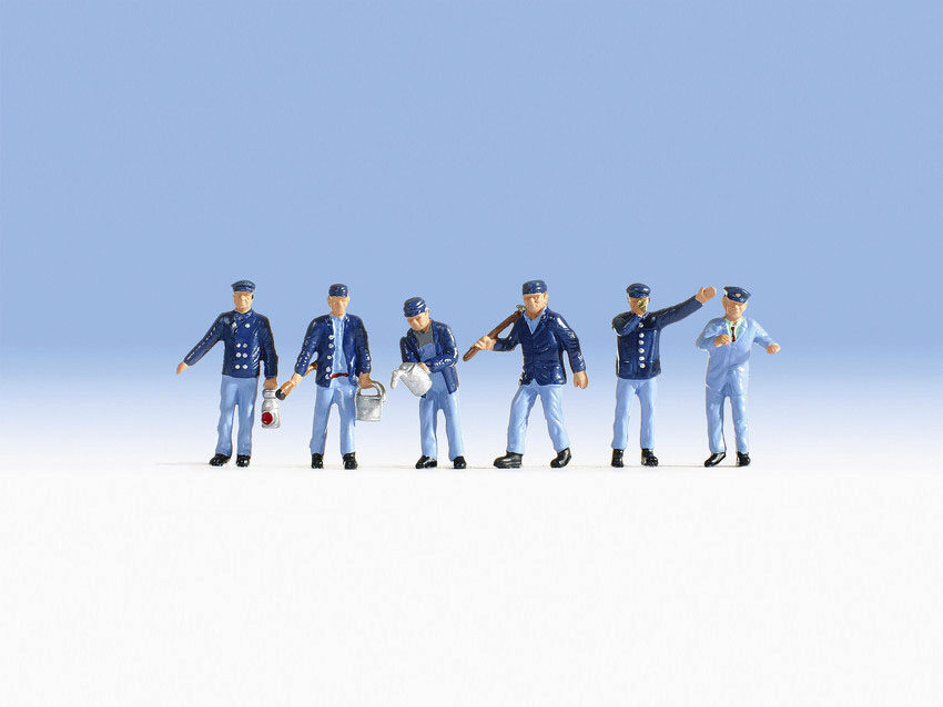 Die Modellfiguren sind in der Spur H0 (Maßstab 1:87, ca. 2 cm hoch) ausgeführt und haben typische Arbeitshaltungen. Die Modelle sind ideal um Lokomotiven, Bahnhofsszenen oder Szenen in einem Bahnbetriebswerk zu dekorieren.
