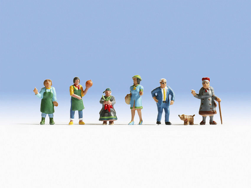 Die Modellfiguren sind im Maßstab 1:87 (Spur H0, ca. 2 cm hoch) ausgeführt und handbemalt. Die Figuren sind ideal im einen Markt auf einem Dorfplatz oder in einer Stadt realistisch zu dekorieren.