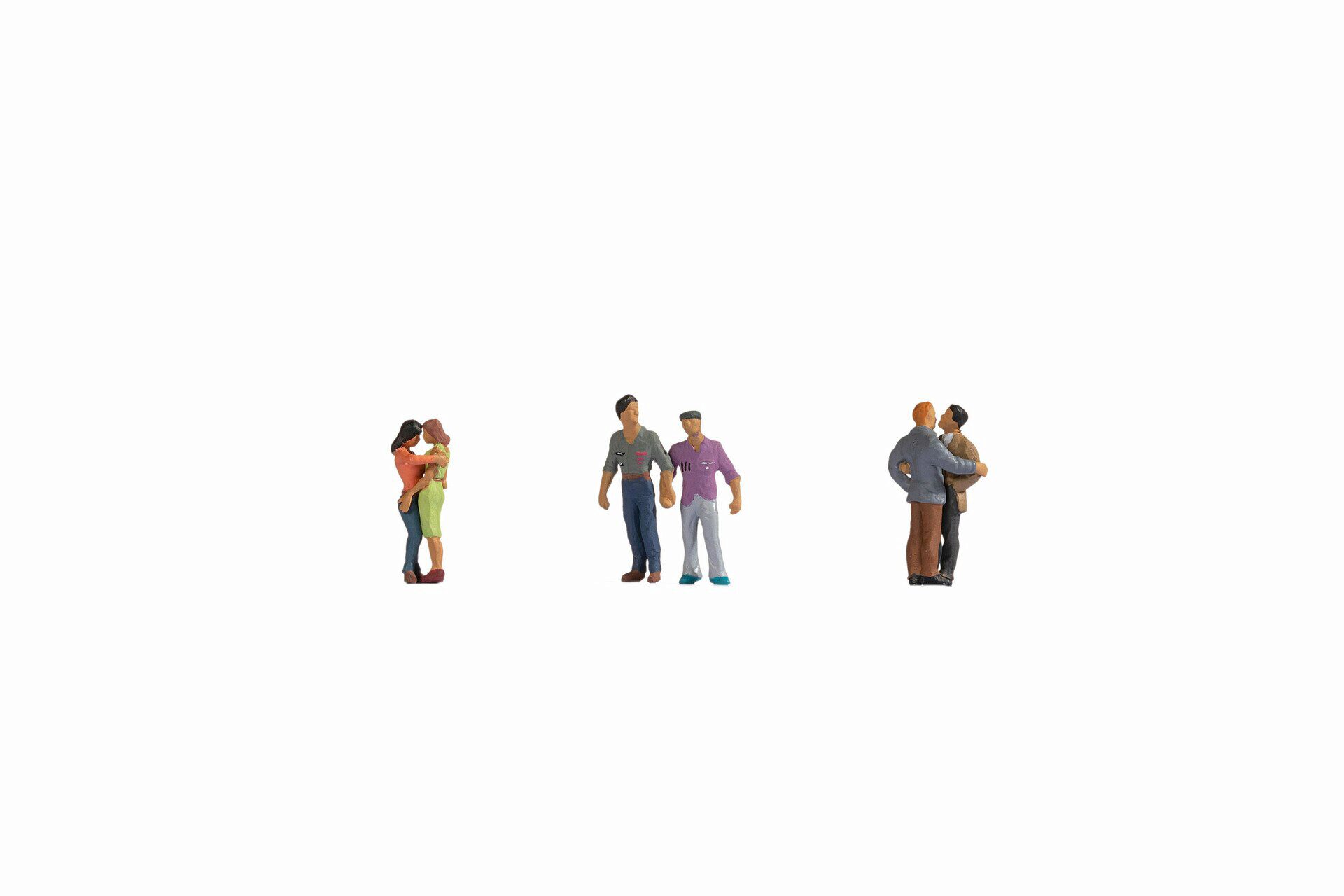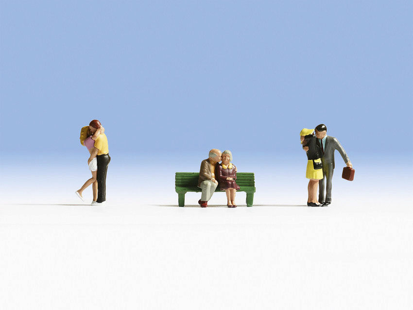 Die sechs Figuren stellen drei Liebespaare dar: Ein junges Paar steht engumschlungen küssend, ein mittelaltes Paar gibt sich einen flüchtigen Abschiedskuss bevor es zur Arbeit geht und schließlich sitzt ein älteres Paar entspannt auf einer grünen Parkbank und genießt den wohlverdienten Ruhestand. Die drei küssenden Paare erzählen eine wunderbare Geschichte von der Liebe in verschiedenen Lebensphasen und sind ideal für die Dekoration von Modellbahnanlagen und Dioramen geeignet.
