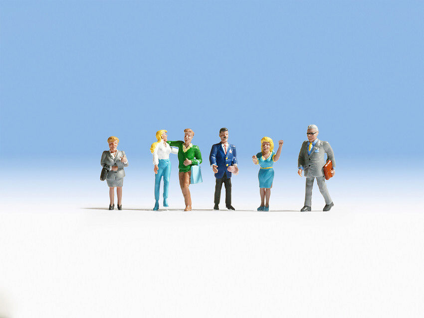 Eine feine ältere Dame im grauen Kostüm steht wartend. Ein sportliches junges Paar geht Arm in Arm. Ein Herr im feinen blauen Sakko steht wartend. Eine blonde Dame im blauen Kleid steht gestikulierend, ein grauhaariger älterer Herr im grauen Anzug mit Aktentasche unter dem Arm geht schnellen Schrittes. Das Figurenset ist ideal geeignet um Stadt- oder Dorfszenen auf Modelleinbahnanlagen zu dekorieren. Die Modellfiguren sind insbesondere für die Dekoration von Städten und Dörfern auf Modelleisenbahnanlagen und Dioramen geeignet.