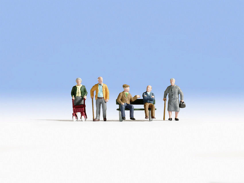 Die Miniaturfiguren stellen Senioren dar. Eine grauhaarige Seniorin mit grauem Rock und grüner Strickjacke geht mit Rollator, ein älterer Herr mit grauer Hose und brauner Jacke geht am Stock, eine alte Damen im grauen Kostüm und Handtasche geht ebenfalls am Stock. Zwei ältere Männer sitzen auf einer Parkbank und unterhalten sich.
