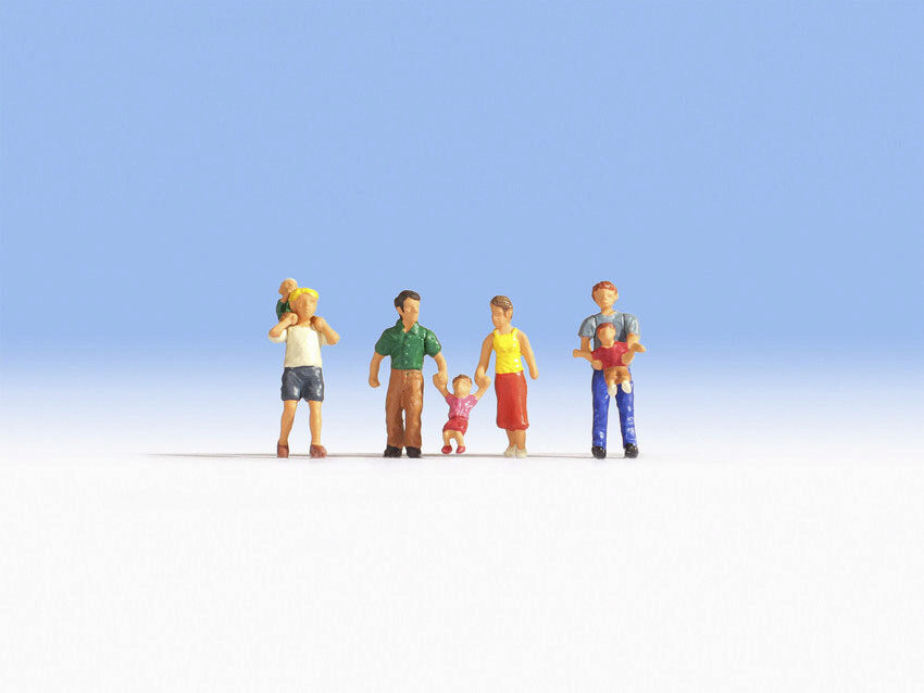 In dem Set für die Spur H0 (Maßstab 1:87, ca. 2 cm hoch) sind vier Elternteile sowie drei Kinder enthalten, die verschiedene Familienszenen darstellen. Ein Vater trägt sein Kind auf den Schultern, ein Elternpaar hält seine Tochter an den Händen, und ein weiterer Vater hebt seinen Sohn spielerisch in die Luft. Die Figuren tragen bunte Kleidung und eignen sich somit ideal für die lebendige Ausgestaltung von Modelleisenbahnen im Bereich von Spielplätzen, Parks oder Gartenanlagen.