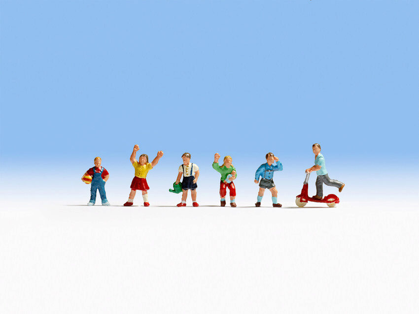Das Set für die Spur H0 (Maßstab 1:87, ca. 2 cm hoch) enthält sechs Kinder, die bunte Kleidung tragen und unterschiedliche Tätigkeiten durchführen. Alle Kinder-Figuren führen Alltagsaktivitäten durch: wie Rollerfahren, Ballspielen oder das Gießen von Blumen. Ein Junge hält lässig einen Ball unter dem Arm, ein Mädchen winkt, und ein weiteres Kind fährt auf einem roten City-Roller. Das Set eignet sich ideal um Leben und Freude in Ihre Modellanlage zu bringen!