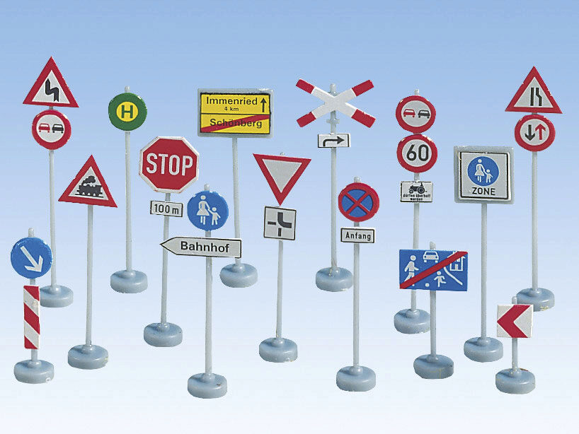 Die "Verkehrszeichen" von NOCH eignen sich ideal als realgetreue Ausschmückung auf einer Modelllandschaftsszene. Die "Verkehrszeichen" geben den Autofahrern Hinweise welche Regeln gelten. Hier muss sich natürlich jeder dran halten, damit auch jeder sicher an sein Ziel kommt. Ob das Stoppschild, Vorfahrtsschilder, Hinweise auf die Fußgängerzone, einen Zebrastreifen oder andere Verkehrssituationen - die Schilder warnen die Autofahrer frühzeitig, damit auch jeder Verkehrsteilnehmer direkt weiß, was los ist und vorauf er Acht geben muss. Gestalten Sie mit den realgetreu nachgestalteten "Verkehrszeichen" jede Modelllandschaft noch perfekter und realistischer aus. Hier ist ein Unterschied zum Original kaum zu erkenne. Jetzt die "Verkehrszeichen" sichern und für Sicherheit auf der Modellanlage sorgen.