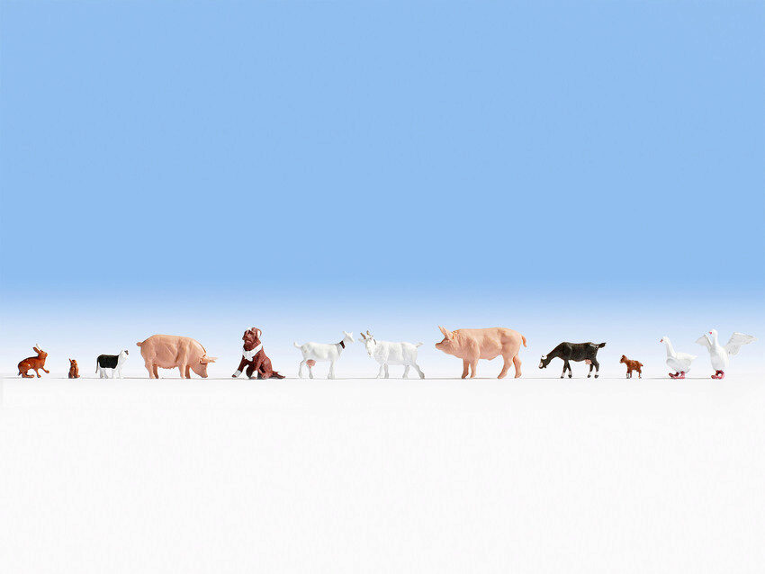 Dazu gehören zwei rosafarbene Schweine, ein braun-weißer Hund, eine Katze in den Farben Schwarz und Weiß sowie zwei weiße Gänse. Auch enthalten sind zwei weiße Ziegen, eine dunkle Ziege und ein brauner Hase.