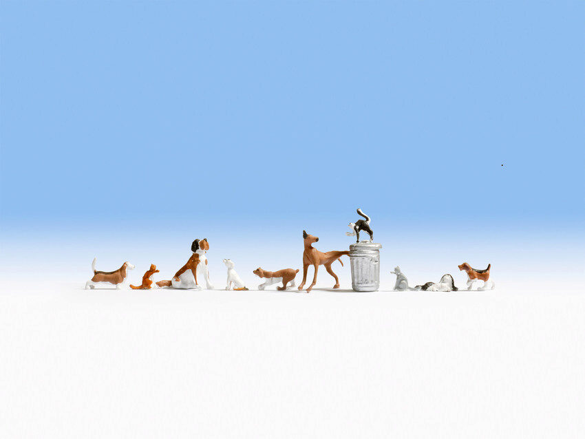 In dem Set für die Spur TT (Maßstab 1:120, ca. 1,5 cm hoch) sind sieben Hunde und drei Katzen enthalten.