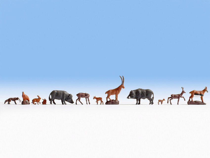 Ein Fuchs trägt seine Beute im Mault während ein Reh wegrennt. Ein anderes Reh putzt sich und das Rehkitz läuft zu seiner Mutter. Zwei Gämsen stehen auf einem Stein und halten Ausschau. Außerdem beinhaltet das Set zwei ausgewachsene Wildschweine, zwei Hasen und ein Huhn das ebenfalls auf einem Stein steht und den Kopf neigt, um Körner zu picken.