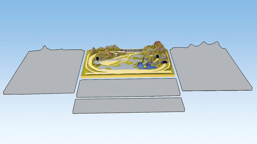 Fertiggelände "Cortina" in Spur Z. Abnehmbare Berggipfel erleichtern den Einbau. Zwei Abstellgleise und ein großer See mit Bachlauf komplettieren die Anlage, die übrigens auch für den Einbau einer funktionsfähigen Oberleitung geeignet ist. Das Fertiggelände "Cortina" besteht aus zwei Bahnstromkreisen!