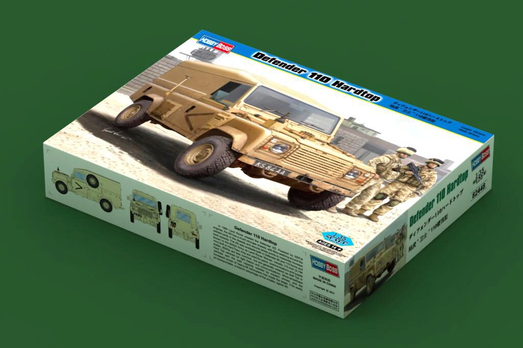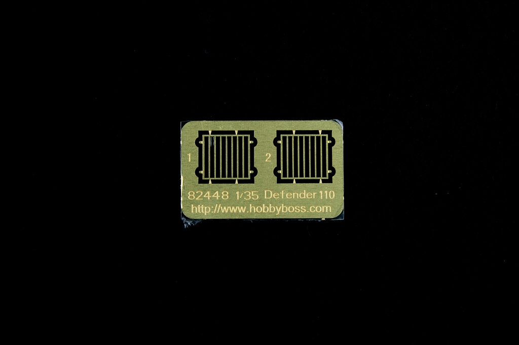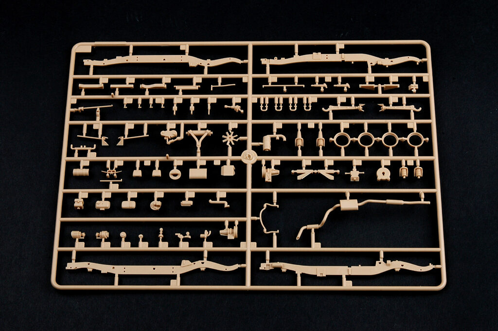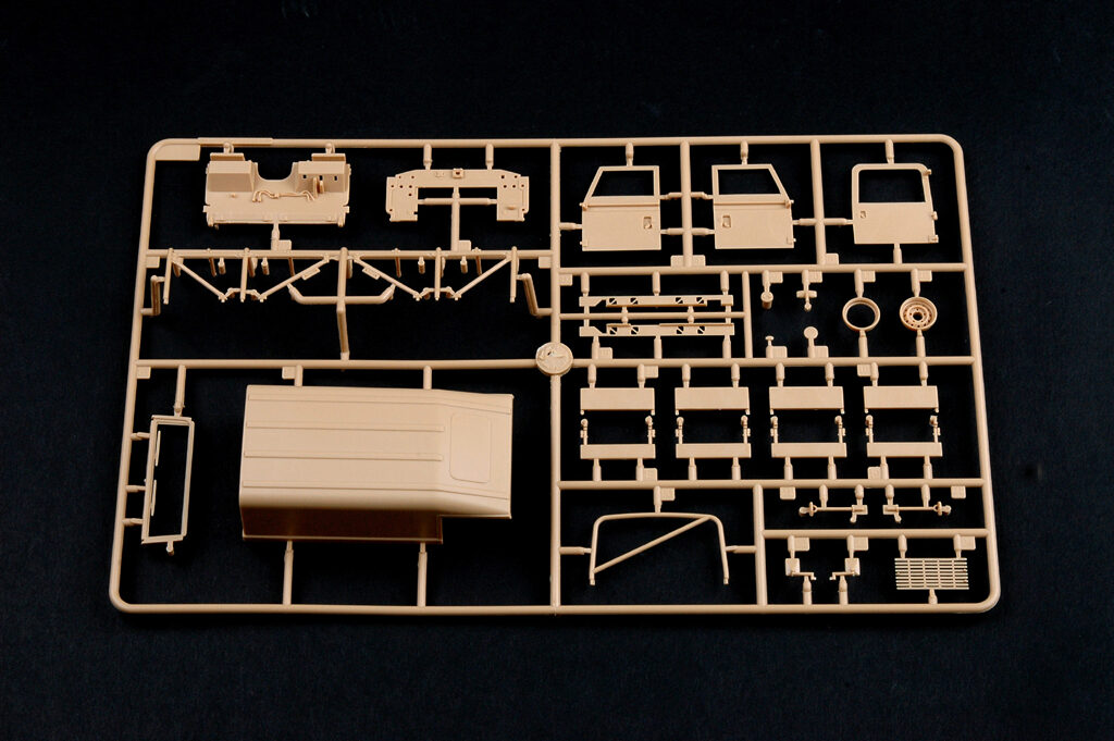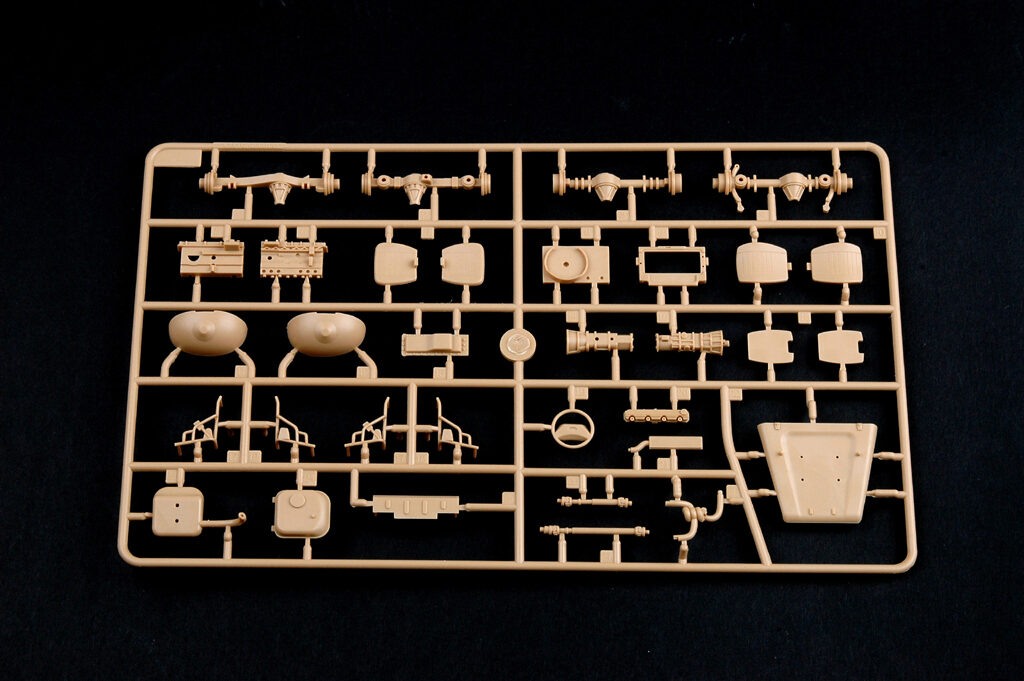 Plastikmodellbausatz eines britischen Militärjeeps mit über 190 Teilen, Photoätzteilen und Gummireifen. Länge gebaut: 132 mm / Breite: 63 mm.