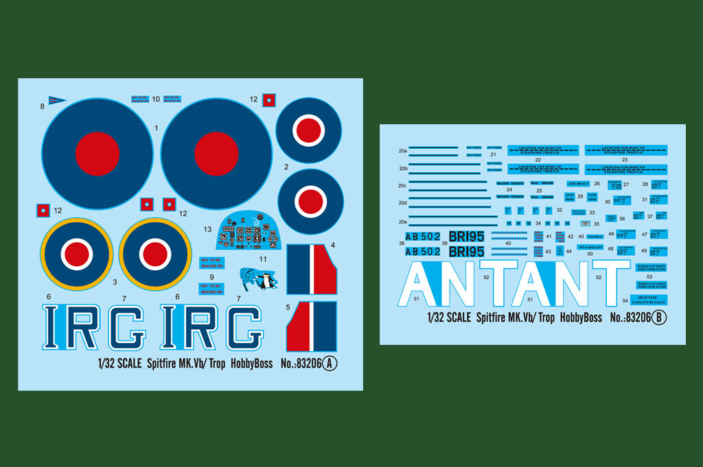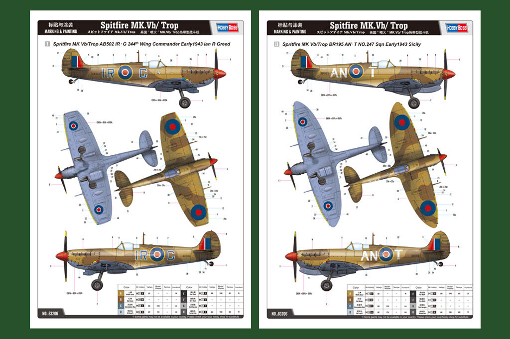 | Camouflage Scheme | 1. Spritfire MK Vb/Trop AB502 IR·G 244th Wing Commander Early1943 Ian R Greed 2. Spritfire MK Vb/Trop BR195 AN·T NO.247 Sqn Early1943 Sicily |