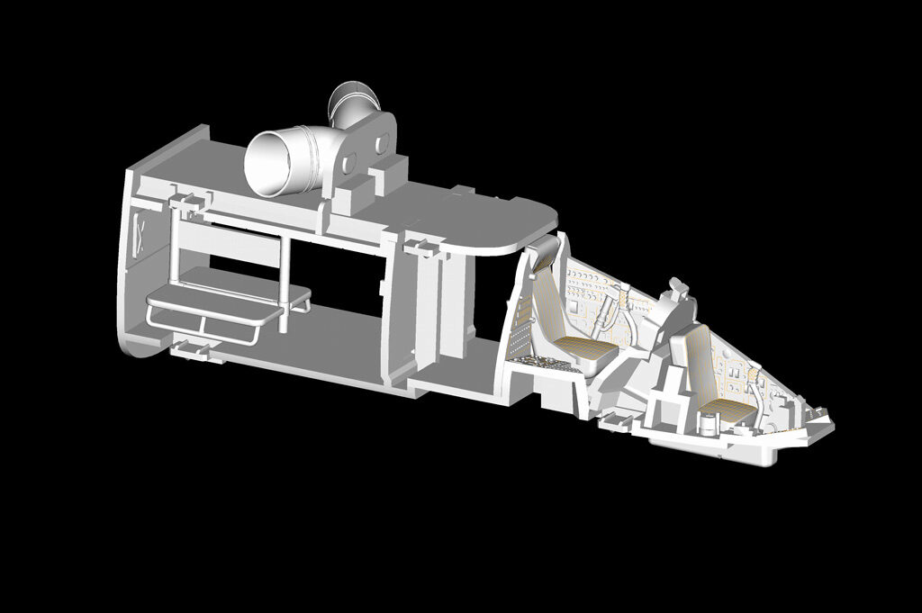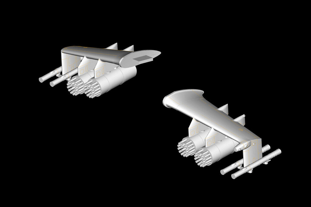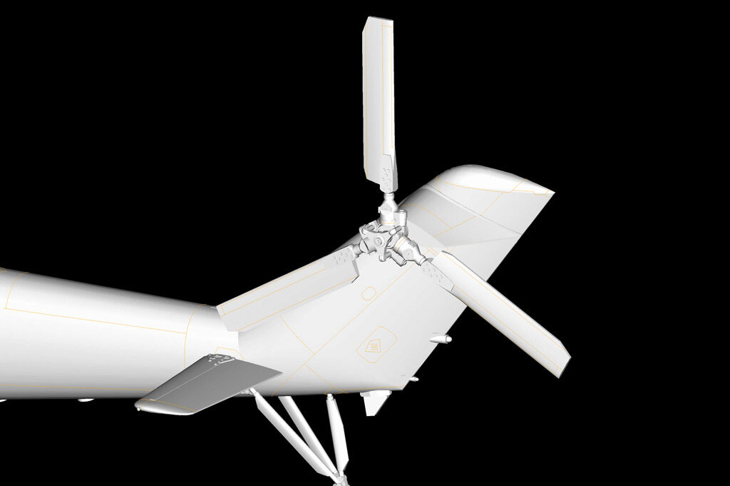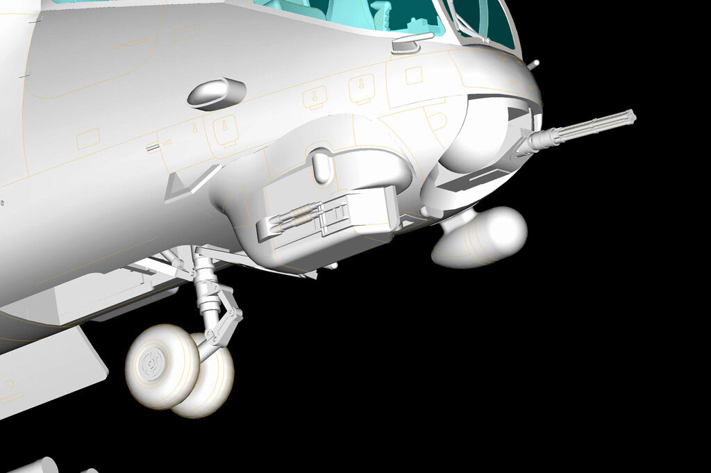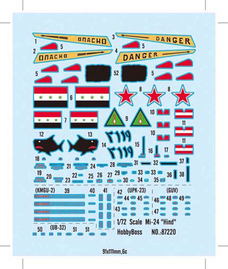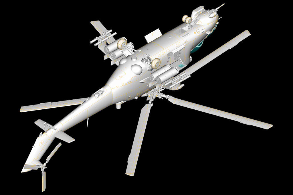 Plastikmodellbausatz eines russischen Kampfhubschraubers aus den 1970er Jahren mit 213 Teilen. Markierungen der russischen und der polnischen Luftwaffe. Länge gebaut: 257 mm / Rotordurchmesser: 240 mm.