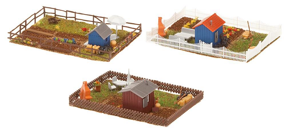 Set mit 3 verschiedenen Schrebergärten mit Gartenhäuschen, jeweils separat umzäunt.