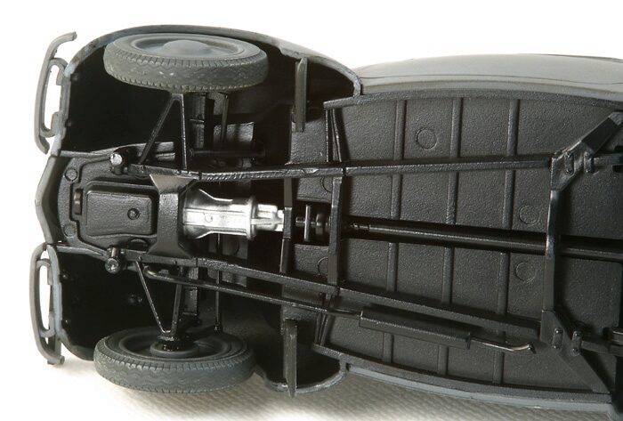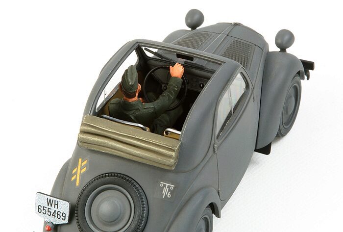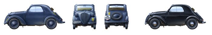 Das Standmodell ist eine Nachempfindung des deutschen Simca S5, welcher ein Dienstwagen war. Der Simca war fast identisch mit dem Fiat 500, da er tatsächlich von Fiat entworfen wurde. Eine große Anzahl dieses Fahrzeugs wurden mit der Eroberung Frankreichs von den deutschen vereinnahmt. Dieses Fahrzeug wurde im Anschluss daran als Transportwagen bzw. für Verbindungsaufgaben im Militärdienst verwendet. Die TAMIYA Modellbaukastenversion besticht durch die hohe Passgenauigkeit, als auch durch die Detailtreue.