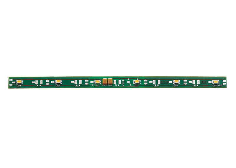 Für alle Minitrix Personenwagen mit Stromaufnahme von jeweils einem Leiter je Drehgestell. Bestehend aus einer kürzbaren LED-Lichtleiste (sunny-gelb, für frühere Epochen) und Schleiferfedern. Die LED-Lichtleiste ist mit einem Elko zur Energiepufferung (Flackerschutz) und einem Dimmer (Poti) ausgestattet.