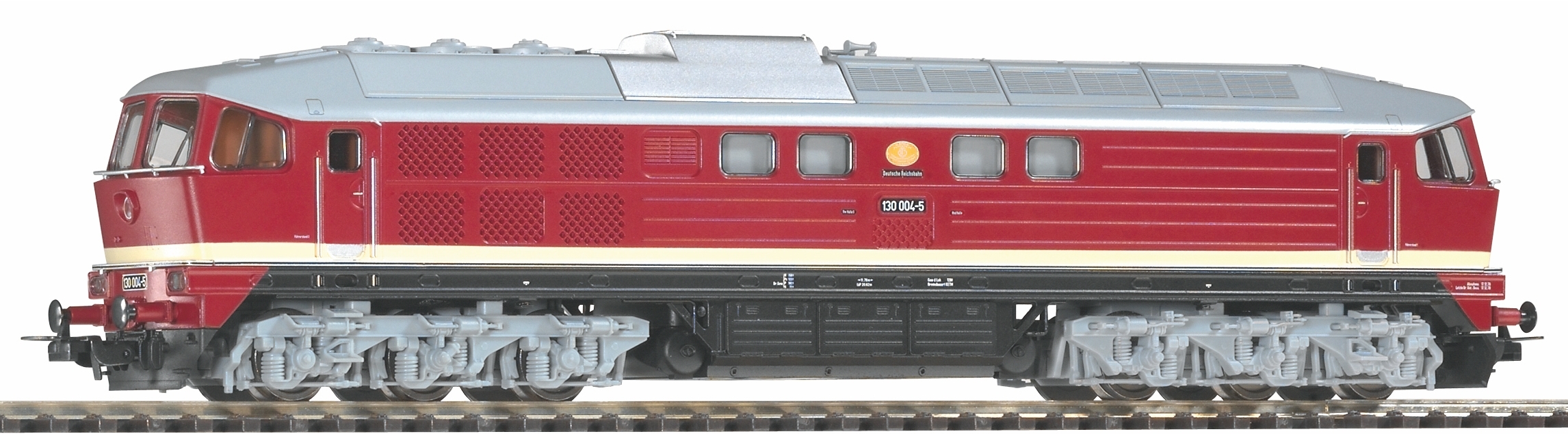 Das PIKO Modell der Lokomotive 130 006-0 stellt das erste, konsequent vorbildgetreue H0-Modell der DR-Baureihe 130 dar. Exakt am Vorbild orientiert, verfügt die PIKO 130 über die großen Stirn- und Seitenfenster der ersten Lieferserien. Ebenso typisch waren wie die separat angesetzten Handlaufstangen vor den Führerständen und das "aufgeräumte" Dach. Die 130 ist zwar kürzer als die Baureihe 132, erscheint mit ihren herabgezogenen Frontschürzen jedoch auch im Modell größer und wuchtiger. Einen ganz besonderen Clou stellt die vorbildgerecht beleuchtete, seitliche Beschilderung dar. Vorbildorientierte Modellbahner dürfte überdies die exakt wiedergegebene, robuste Drehgestelldetaillierung überzeugen, die auch dem harten Betriebsalltag auf der Modellbahn widersteht. Der mit zwei Schwungmassen versehene Motor verleiht dem Modell zusammen mit dem schweren Zinkdruckguss-Rahmen, dem eleganten Kardanwellenantrieb auf vier Achsen (zwei mit Haftreifen bezogene Räder in diagonaler Anordnung) exzellente Laufeigenschaften und hohe Zugkräfte. Als Modell der PIKO Expert-Linie verfügt die 130 006-0 über Kurzkupplungskinematiken und eine Digitalschnittstelle Plux16/22. Die Nachrüstung mit Sound ist vorbereitet.
